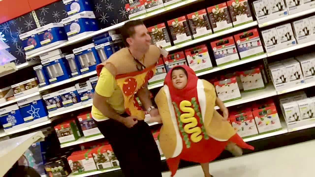 A dancing boy dressed as a hot dog punches his dad in the groin while his dad wears a pizza costume in a store indoors.
