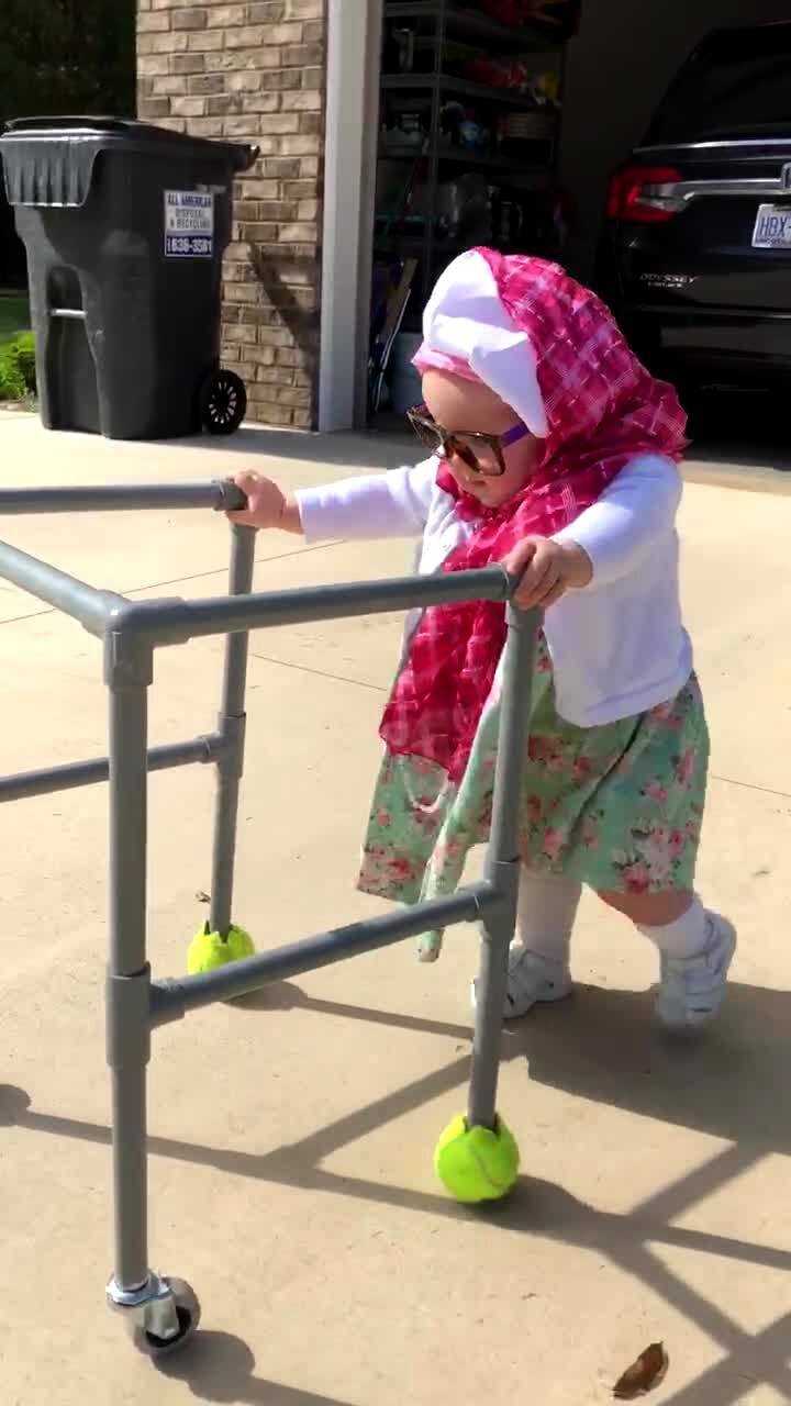 A tot girl in an old lady costume walks with a walker outdoors and then trips and falls as she looks at her mom. Halloween.