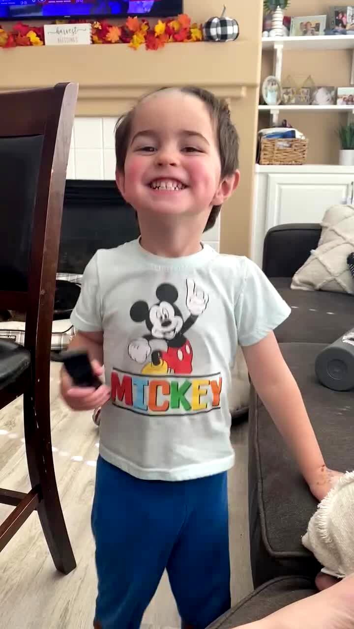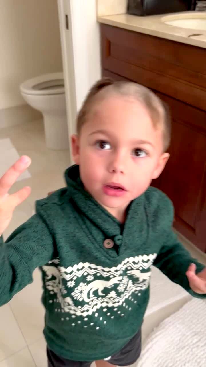 A woman dresses a young boy with a button down shirt. When another woman says he looks "handsome" the boy says "What do you mean I look handsome — I look handsome all the time".