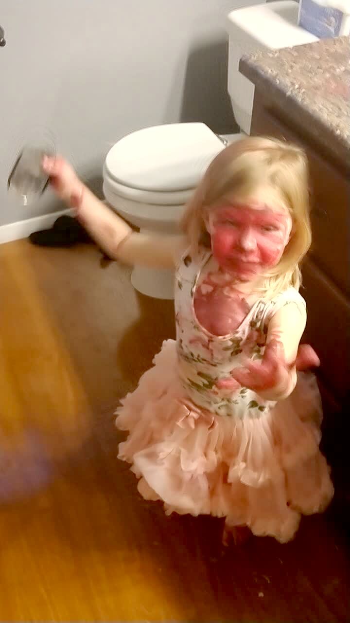 "Whole Lotta Lipstick" A tot girl does a makeup tutorial at home, and she puts on lots of eyeshadow and blush, then she puts on too much lipstick. She uses her own spit to wipe it off, but she puts too much on again and says "definitely need a wipe."