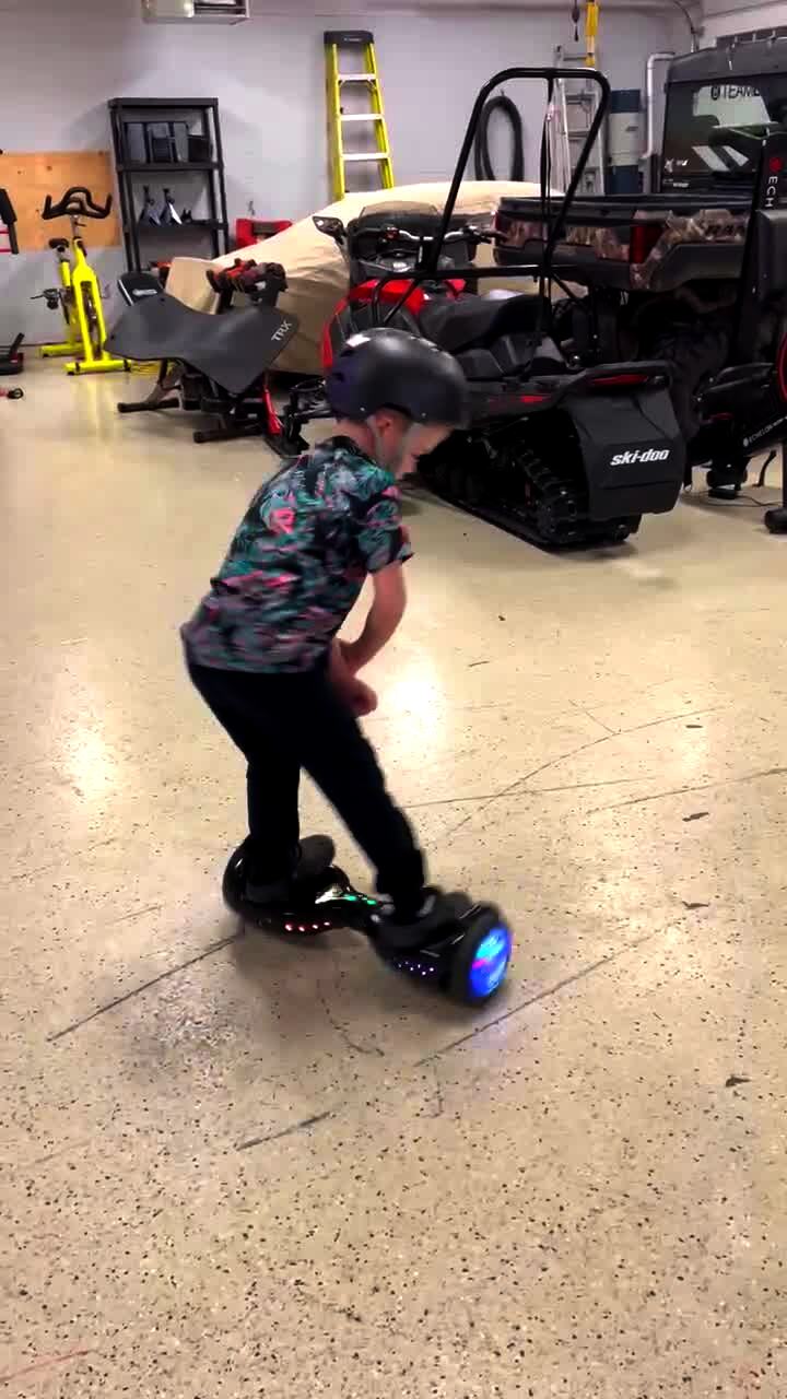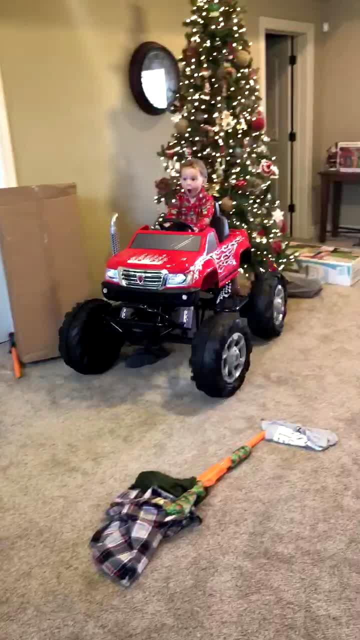 A young boy rides his toy motorized car through the garage, then crashes it into a toilet and breaks it.