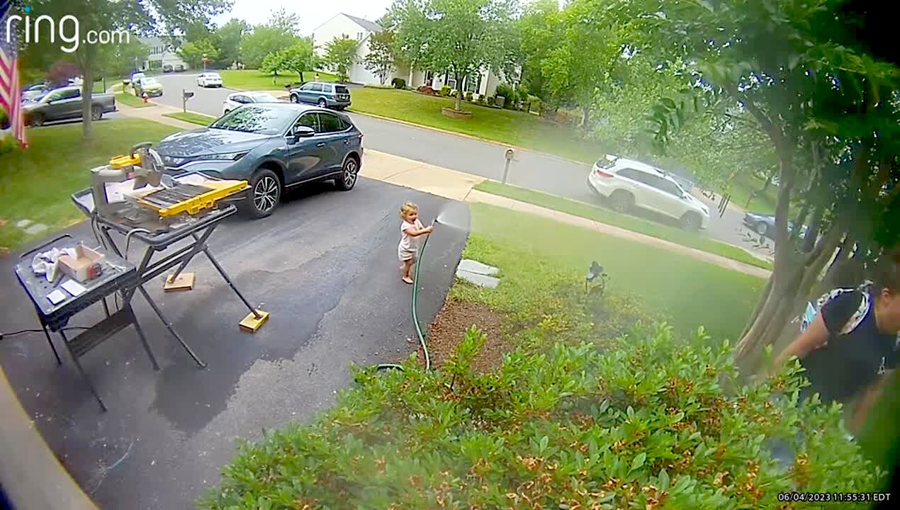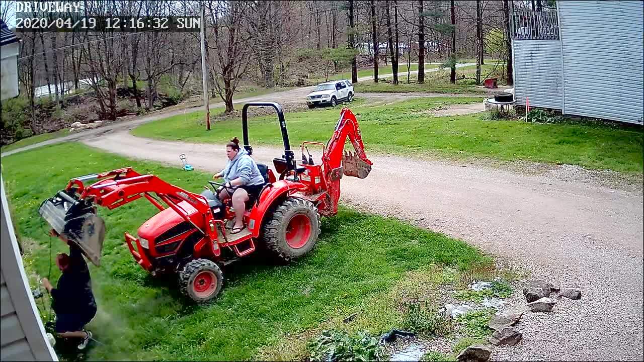 A man cleans the gutter while he stands on the bucket of a tractor. The woman in the driver's seat accidentally hits the lever and drops the man. He falls, gets back up and stares at the woman who holds her hands over her face. Security footage.