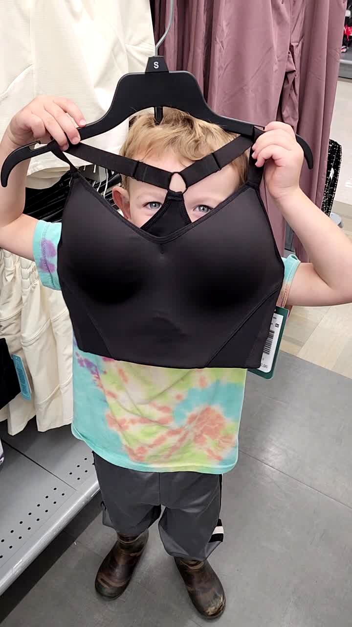 In a department store a young boy holds up a bra over his face like a mask and says he's a "ninja."