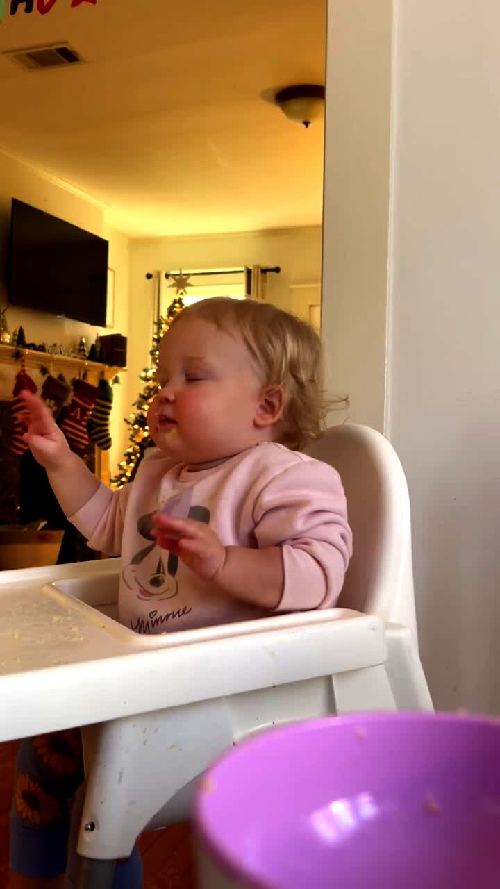 A young girl gets fed banana pudding then does happy dance in high chair.
