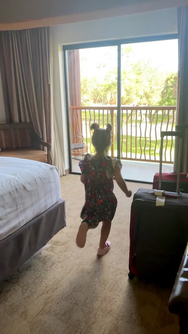 A young girl runs into a closed sliding door in her hotel room, hitting her head on the glass.