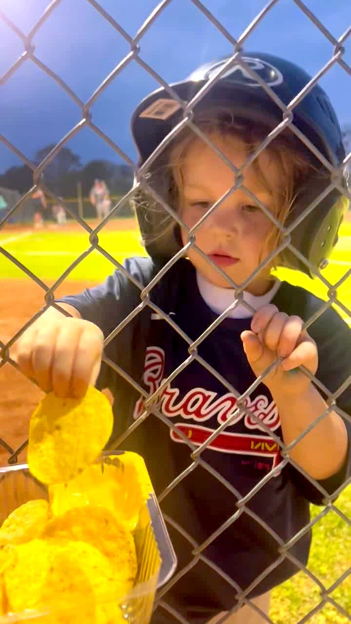 A young girl on a baseball field runs from third base but passes home plate. The girls asks a woman for a nacho, through the chain link fence, then runs back to touch home base.