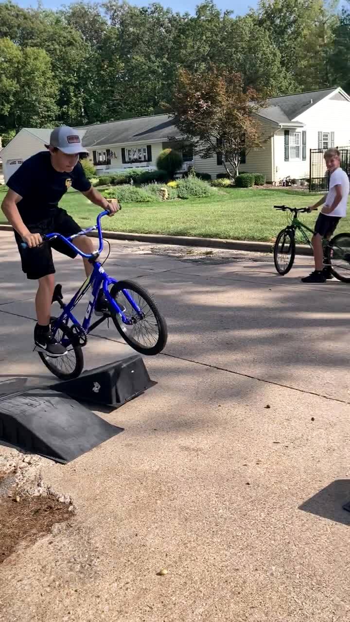 A young boy learns to ride his bicycle as his dad runs alongside of him on a street. He then pedals into the driveway and hits the curb and topples down into a ditch.