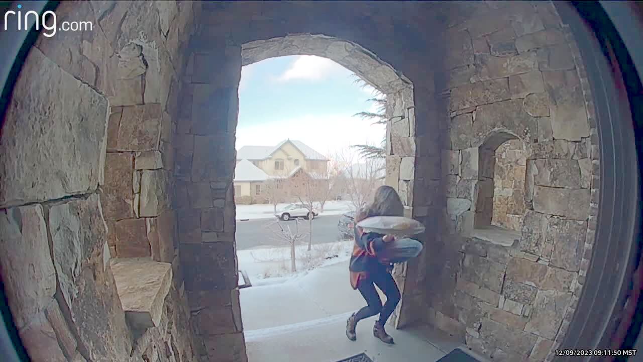 A young boy dribbles a basketball while his mother rides a scooter on a driveway. There is a crash of thunder, and the tot boy screams and runs to the house. The woman drops her scooter, and the boy's father falls down. Security footage.