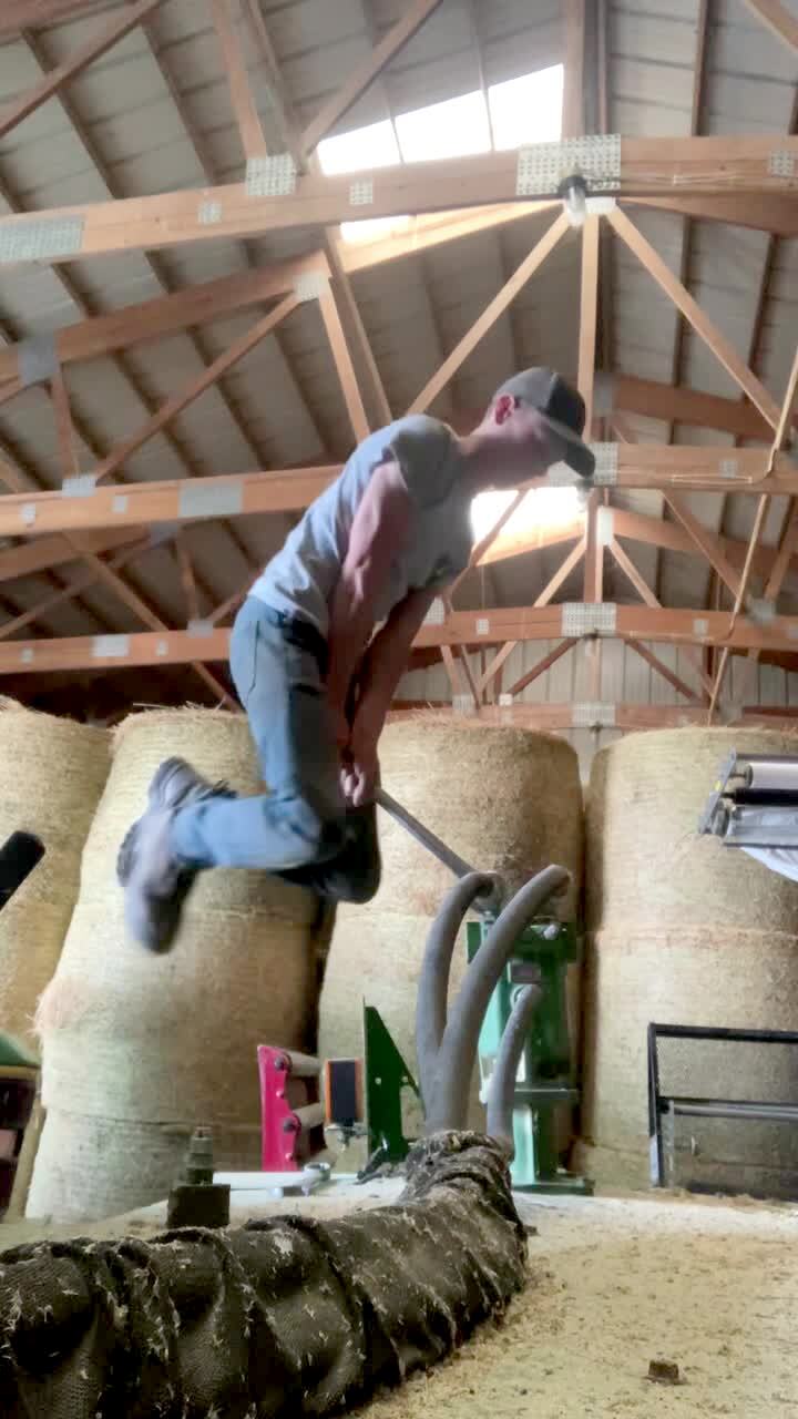 A young girl climbs on hay bales on a farm, then she falls between two hay bales and disappears.