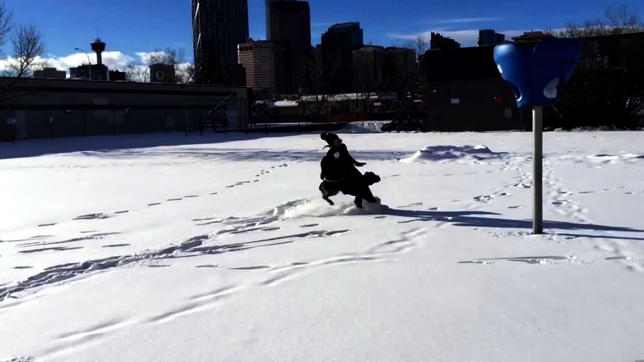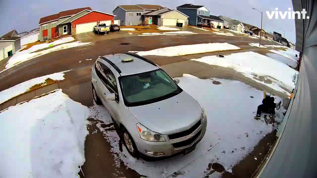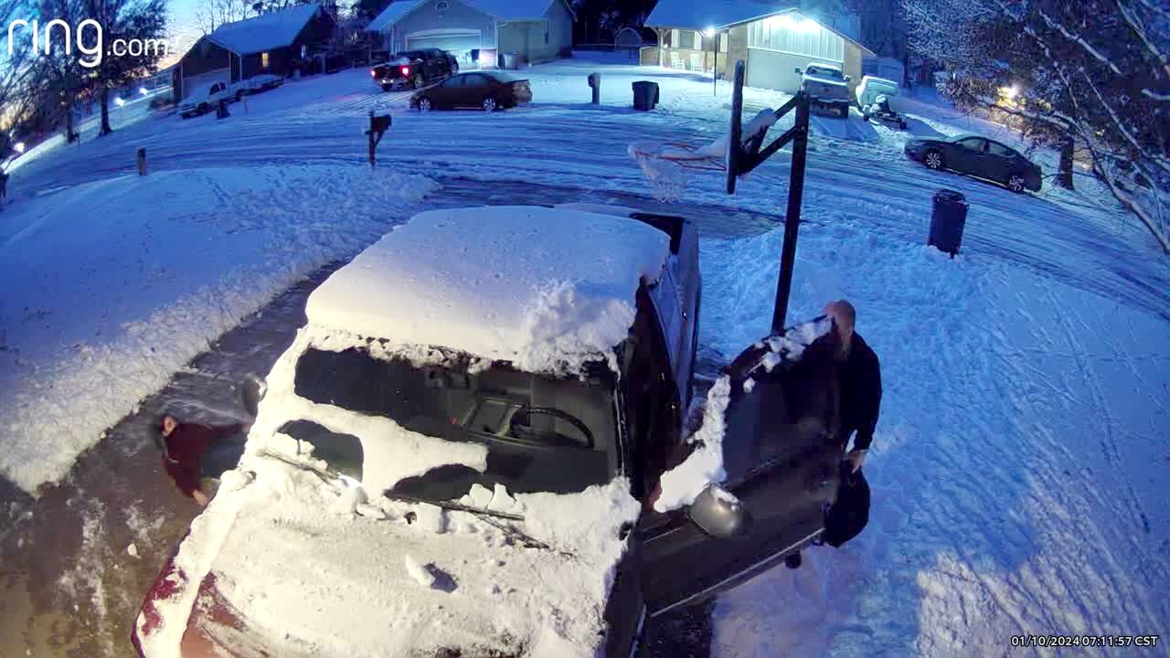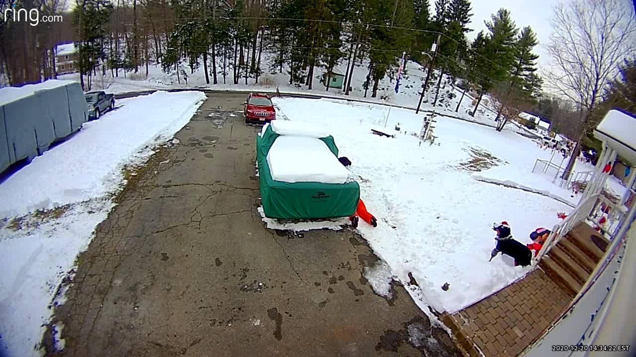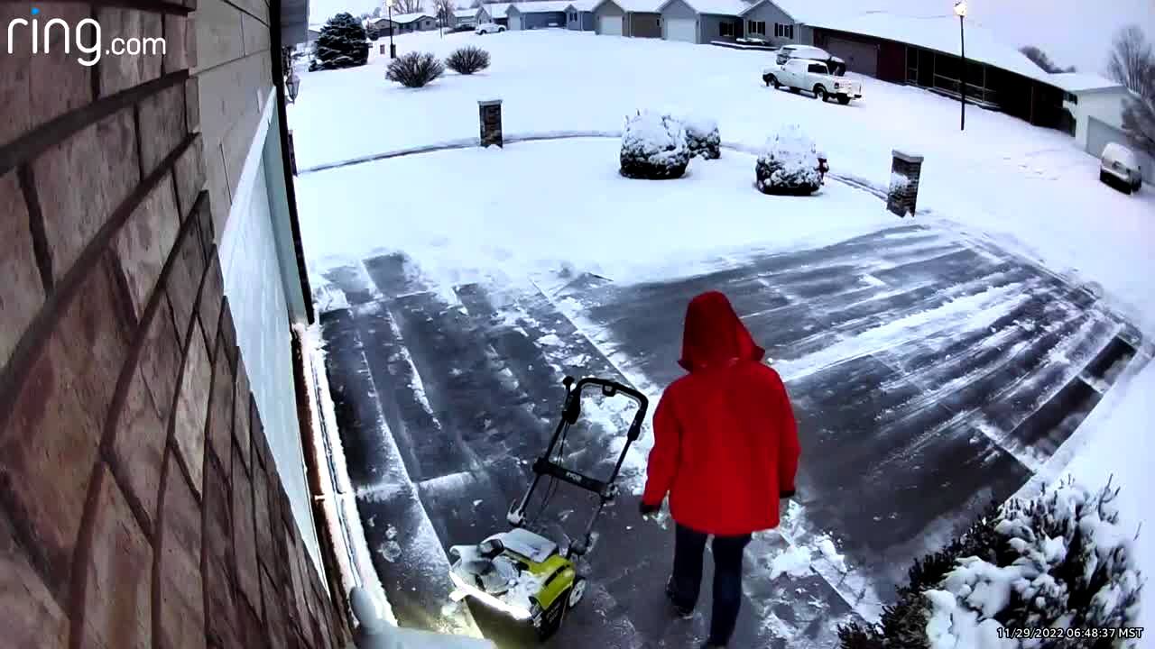 A woman tries to take a dog inside as the dog tries to play in the winter snow. The dog pulls on her leash knocking the woman into a covered car. She falls to the ground. Home security footage.