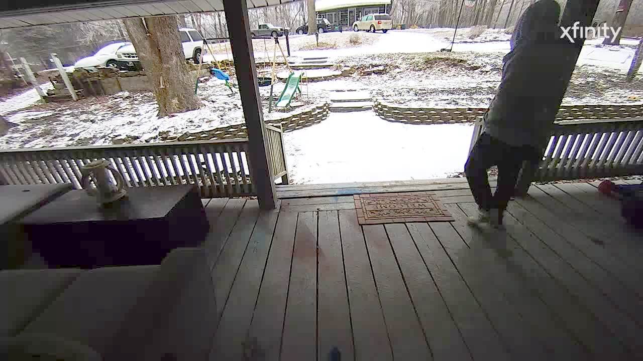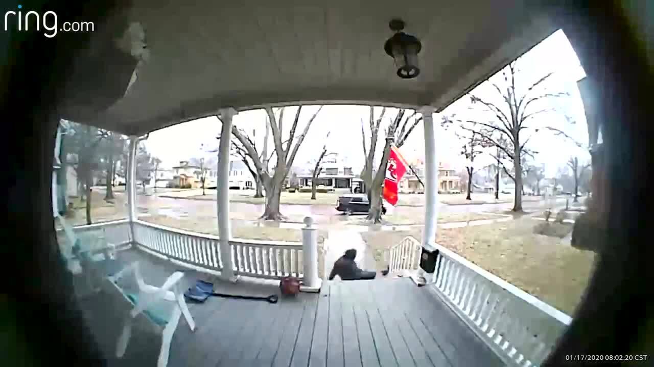 A young man slips on ice and slides down a flight of porch stairs on his butt, losing a shoe. Security footage.