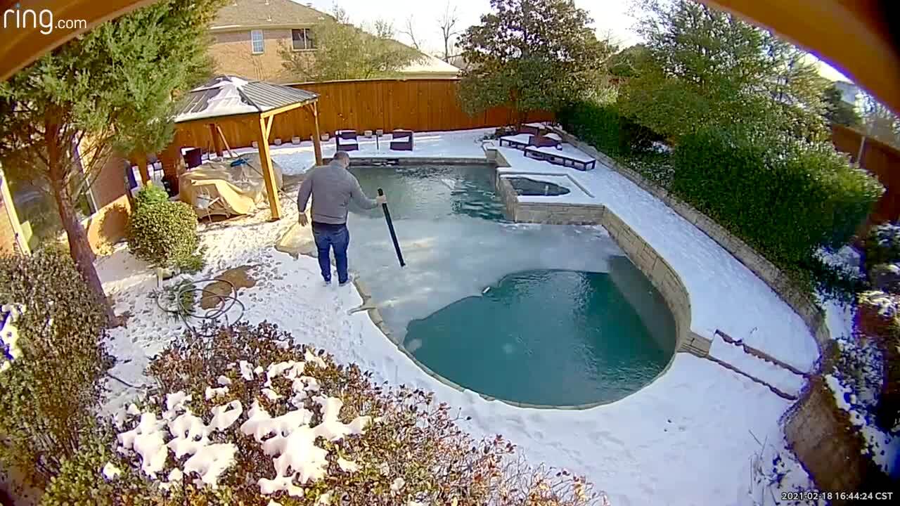 A man taps on a sheet of ice in his swimming pool with a poke, and then he steps onto it but it breaks and he falls in the water. Security footage.