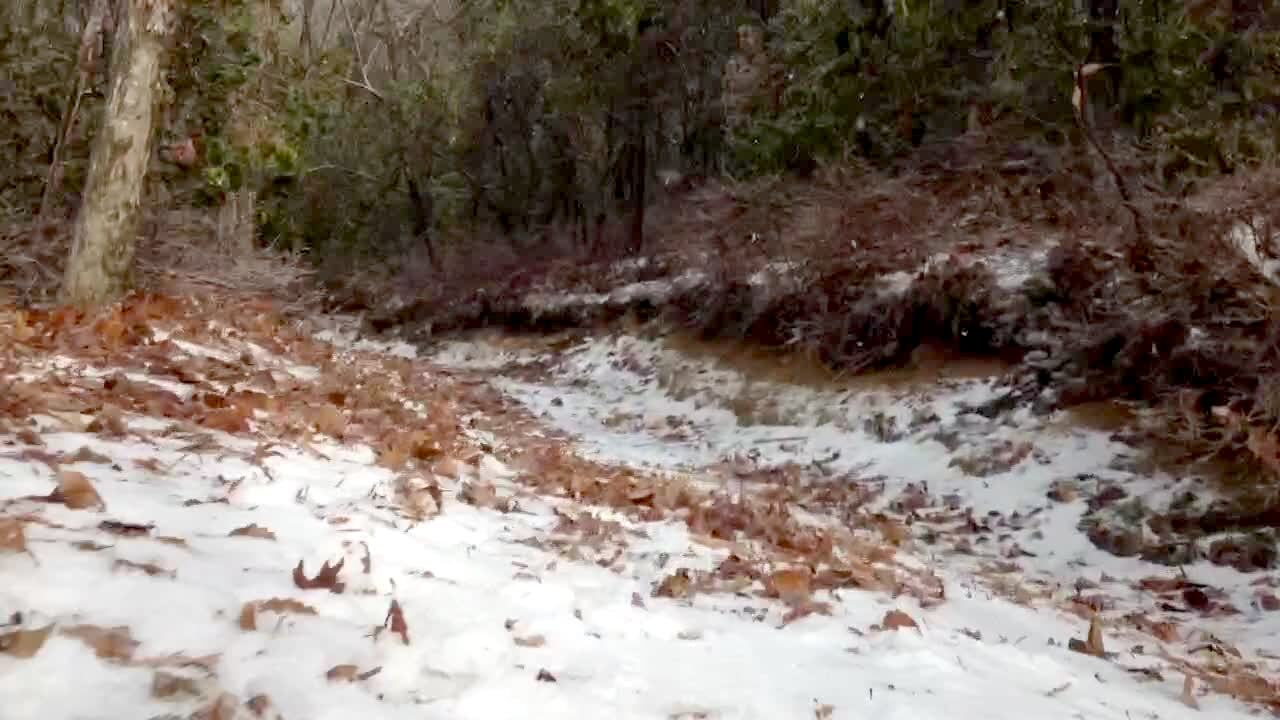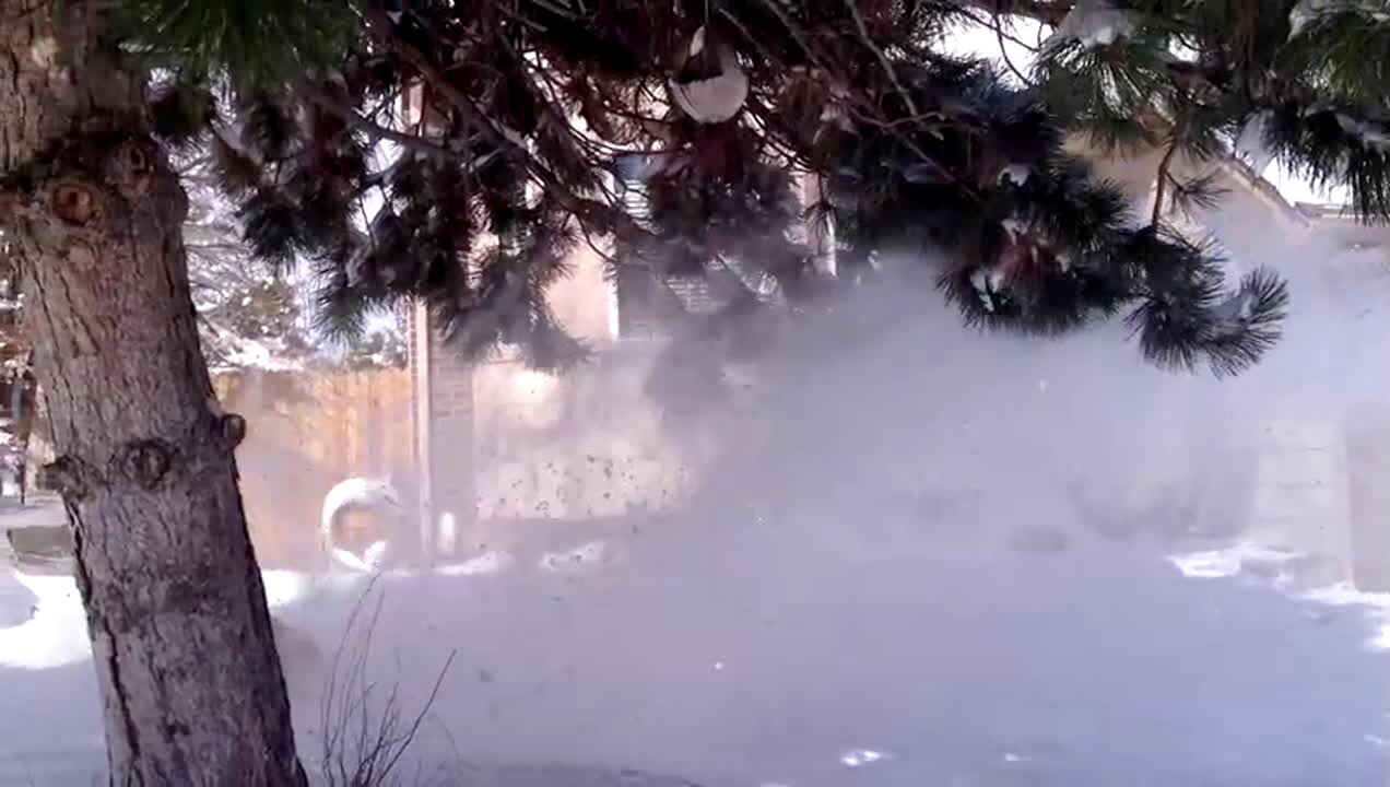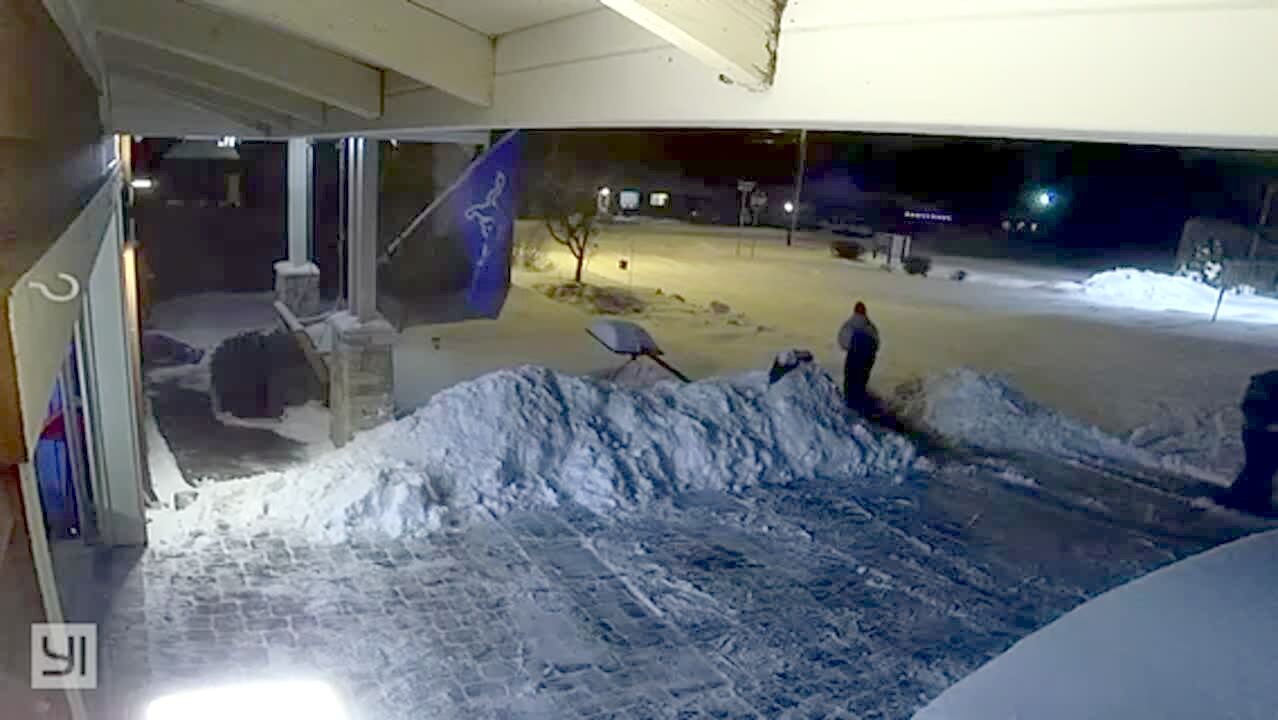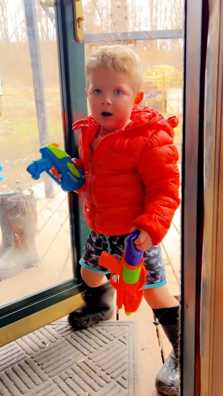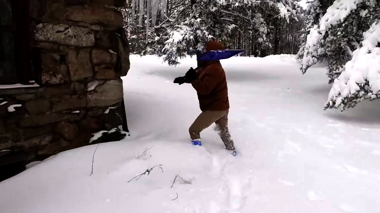 A man carries a shovel full of snow into his house and throws it into the tub with his kids who scream.