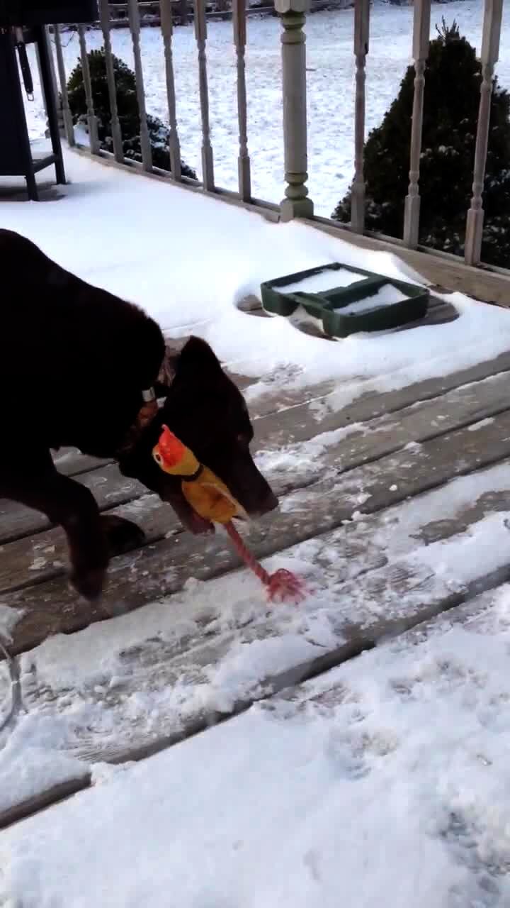 A dog pulls on a rubber chicken toy that's frozen to an icy porch. He gets it unstuck at the end.