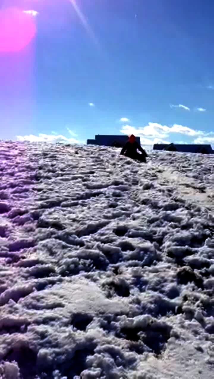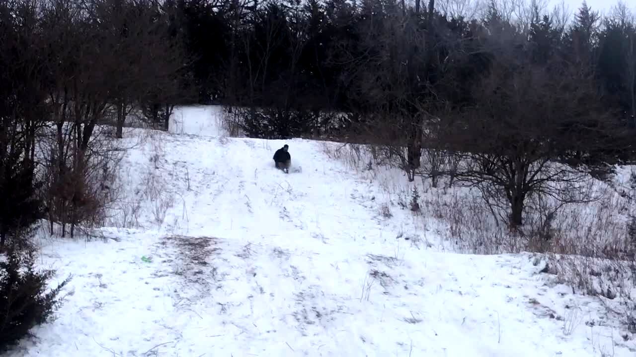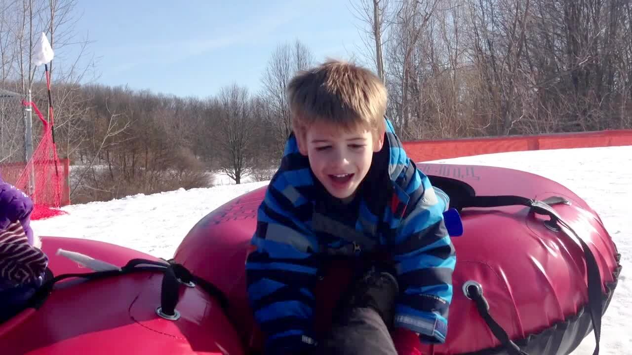 A young boy and girl sled on tubes with their dad. The boy loses his tube and grabs his dad's leg while sledding down the hill screaming. It looks like an action sequence.