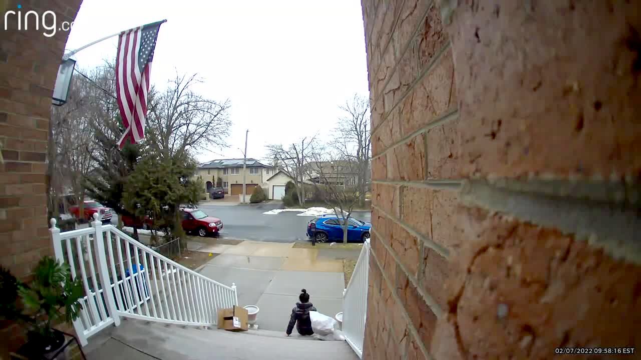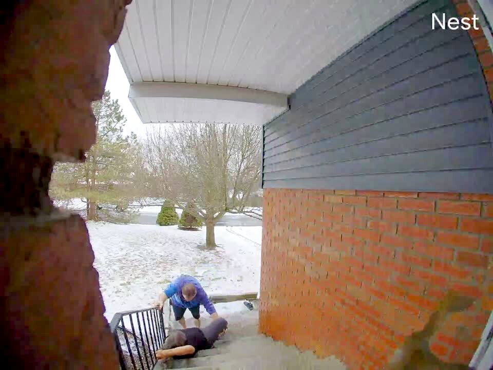 A woman slips and falls down the icy porch stairs and a car honks at her. Security footage.