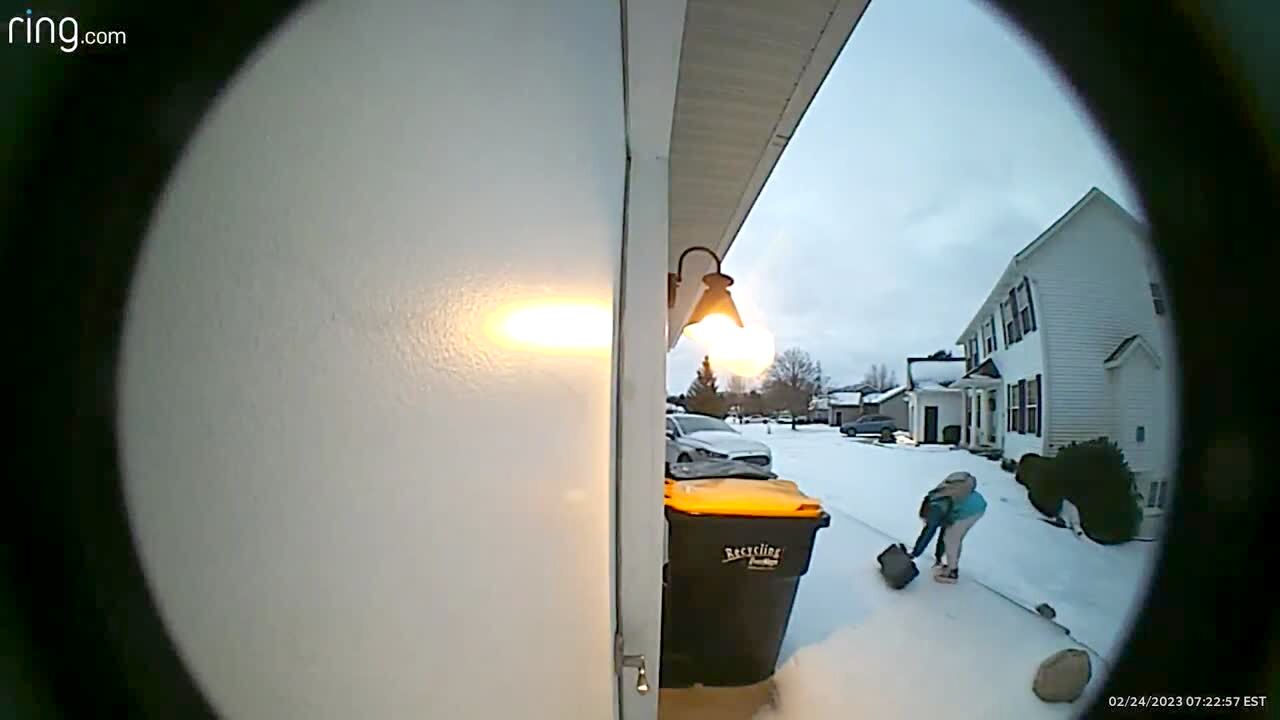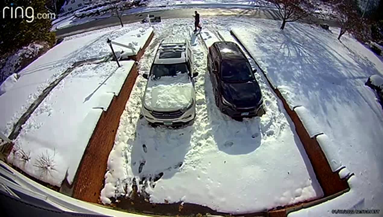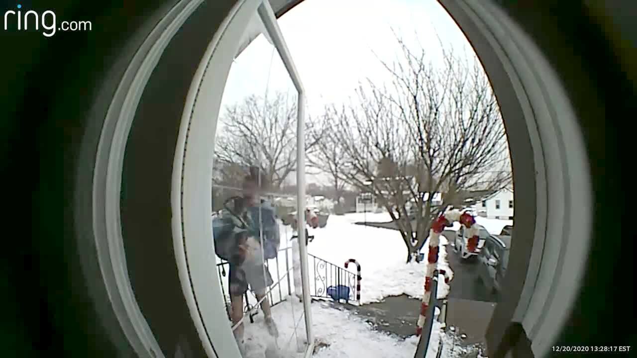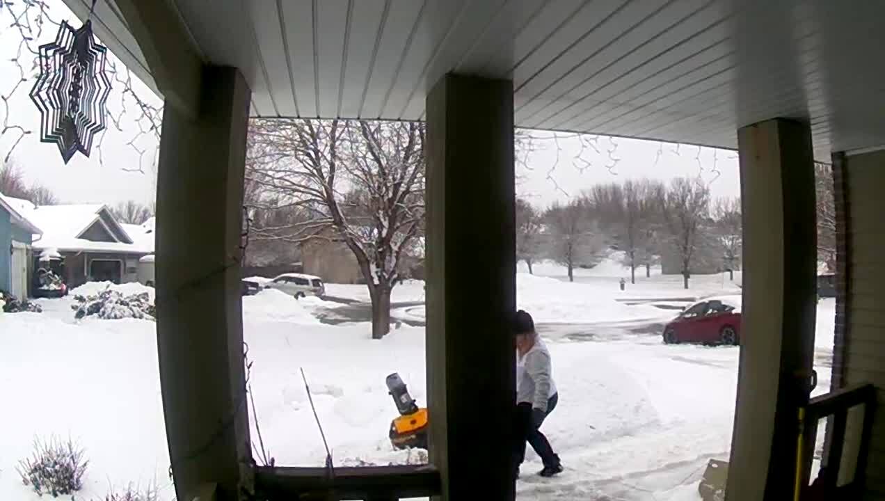 A young girl walks up to her front door, then snow from the roof falls on top of her and she laughs hysterically. Security camera footage.