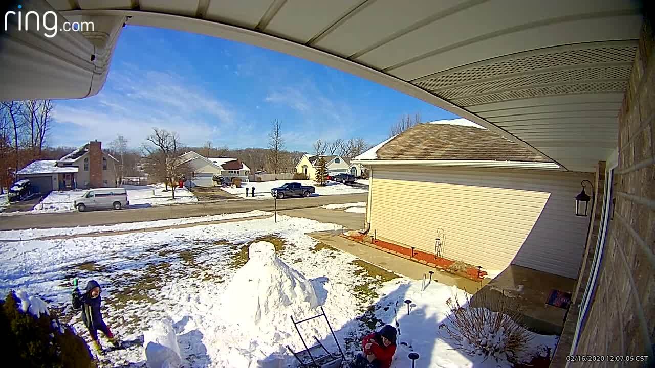 One young boy knocks down a tower of snow in the front yard, and it hits another young boy as he falls to the ground. Home security footage.