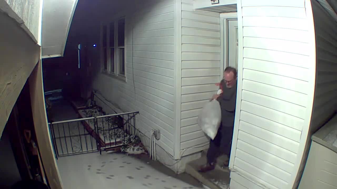 A man slips and falls as he takes out the trash, and he flings the trash bag back at the door. Security footage. No audio.