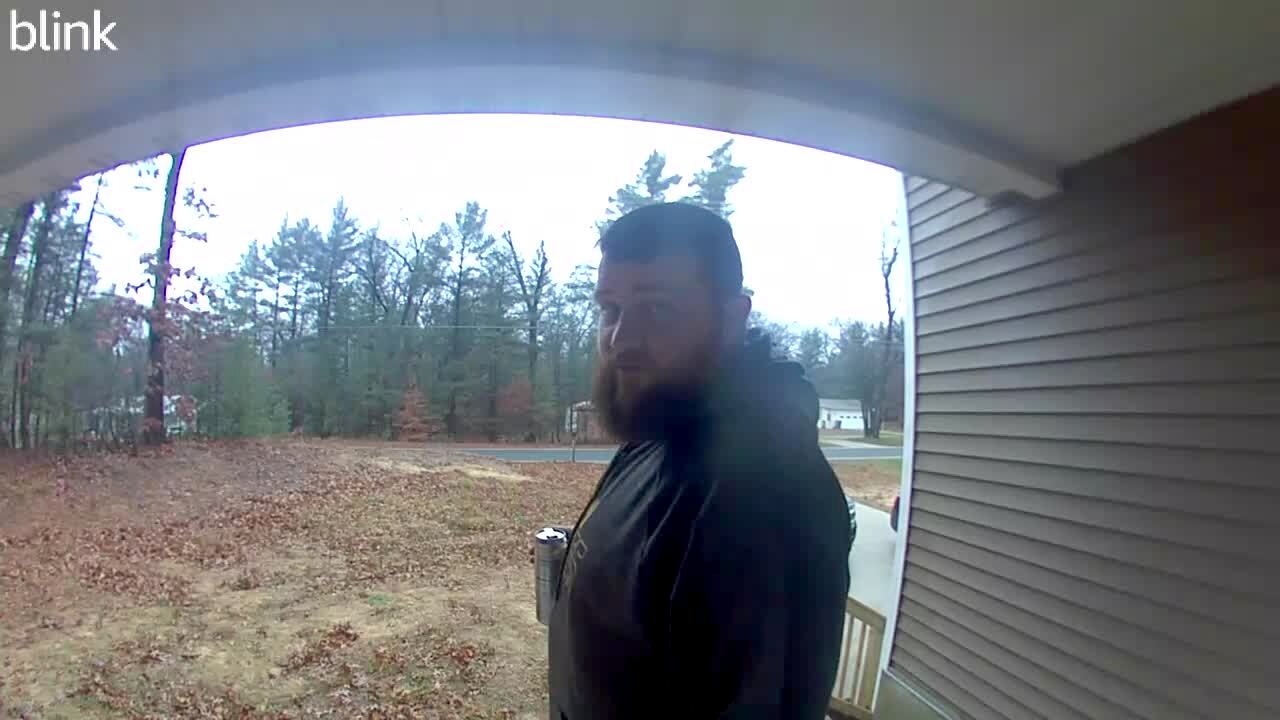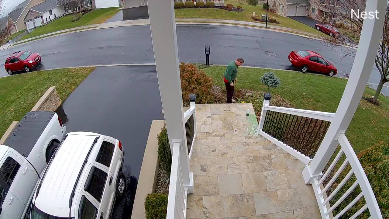 A man exits a front porch and slips and falls backwards then proceeds to cautiously waddle back down a sidewalk. Security footage.