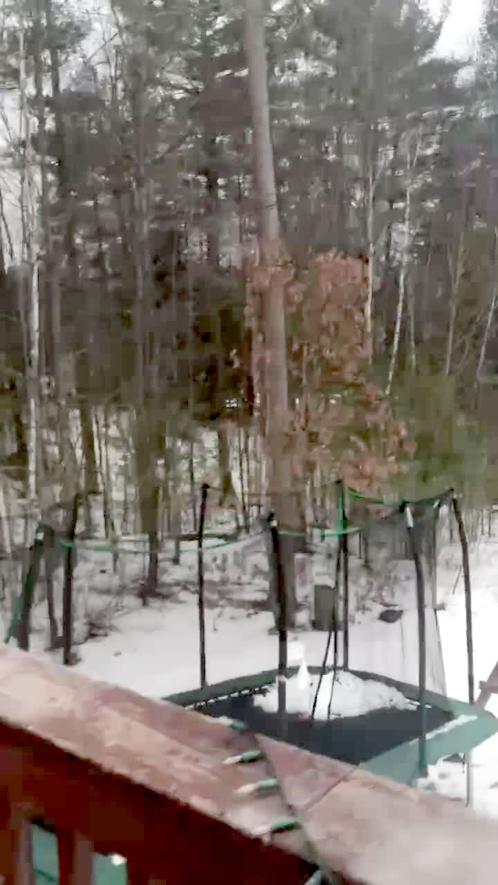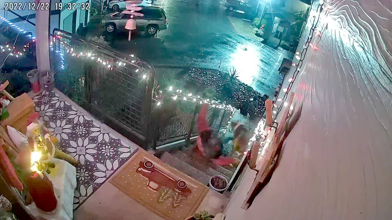 A woman slips on the ice and slides down a long staircase on the side of a house. Security camera.