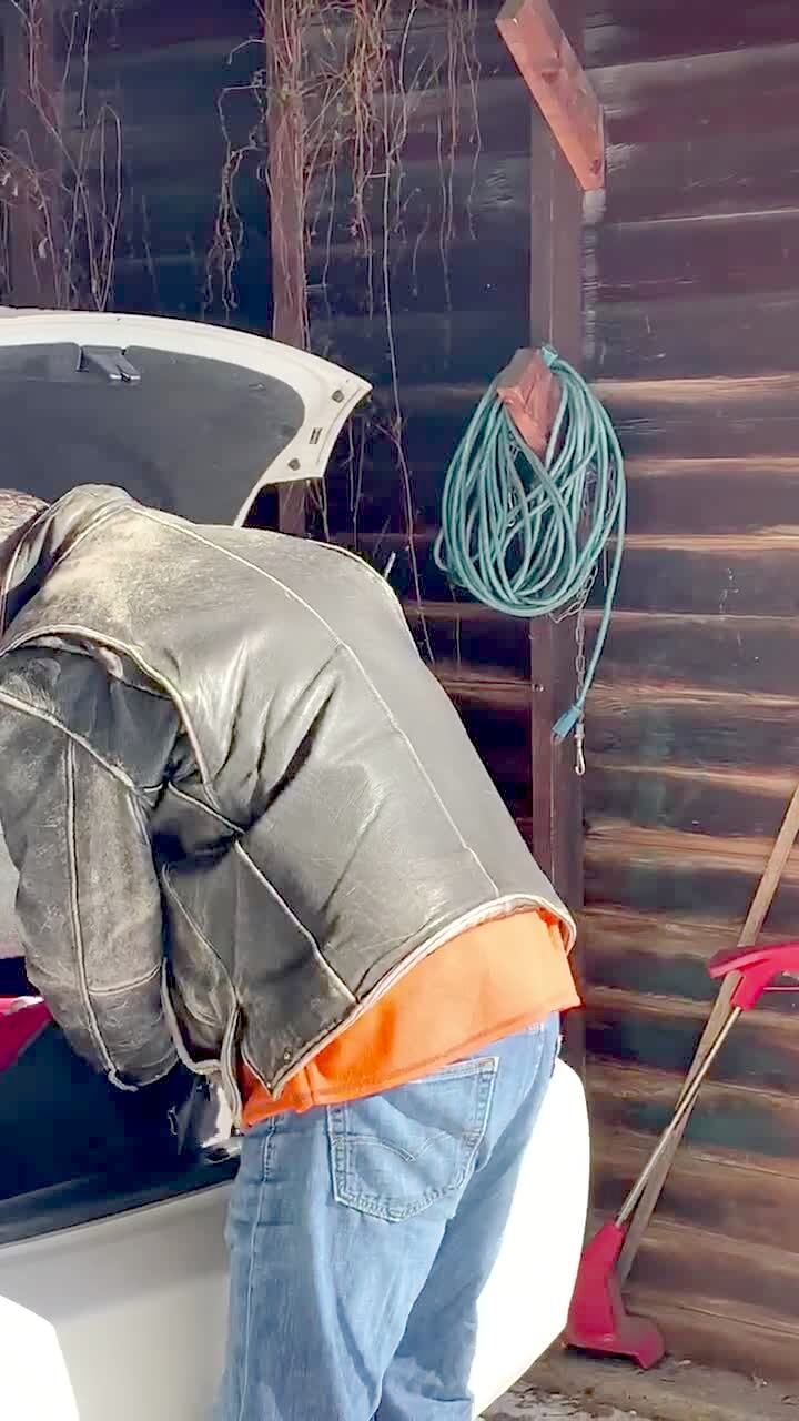 A man opens the trunk of his car in the garage and the woman with the camera says he forgot his gym clothes so they will be frozen. The man pulls the clothes out and all the clothing items are frozen.