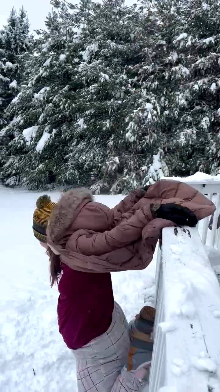 A young woman sits on the backyard deck fence and prepares to jump off into the snow. She slips and falls face first into the snow.
