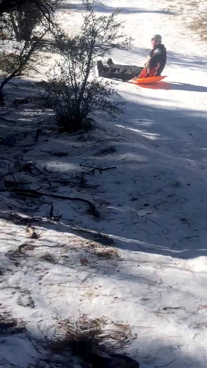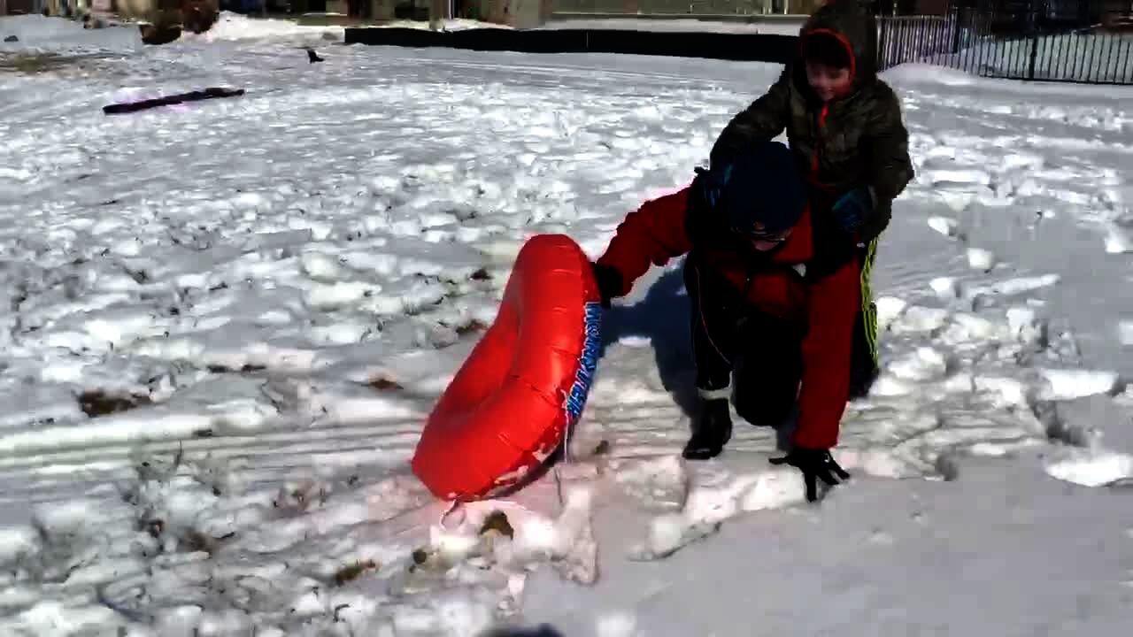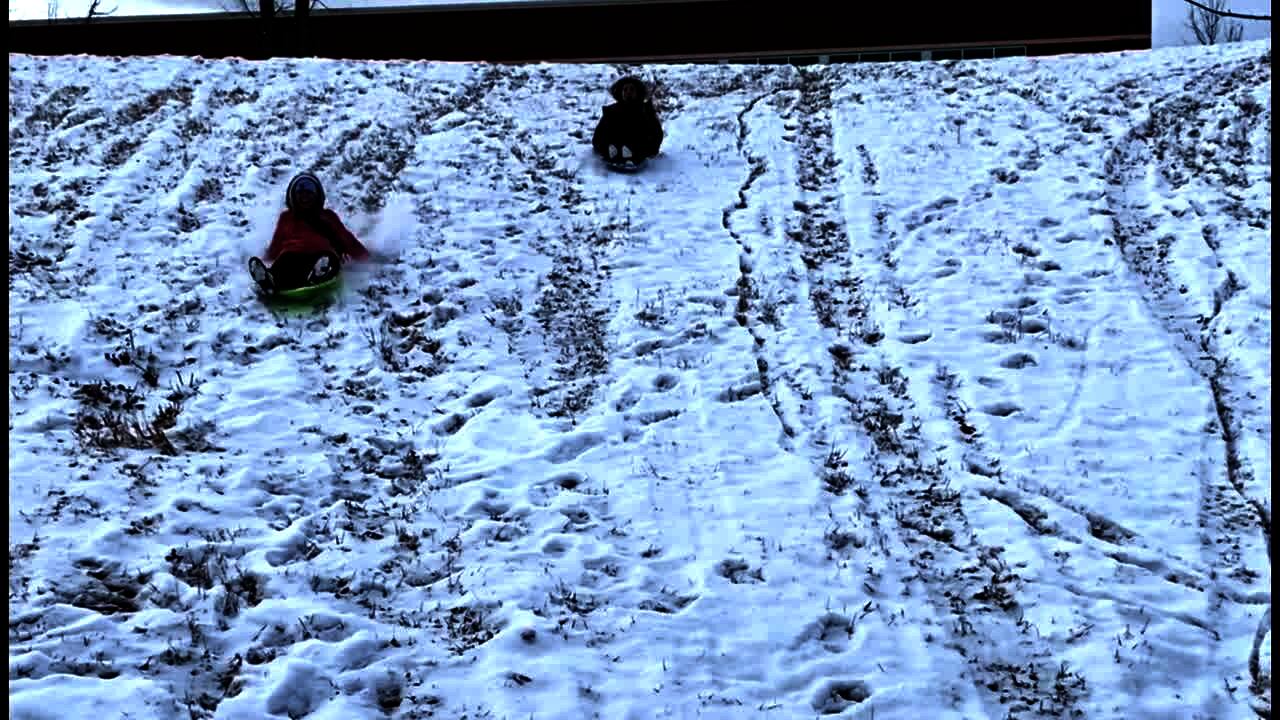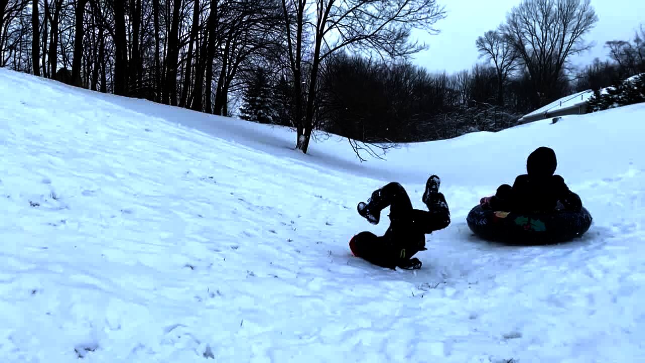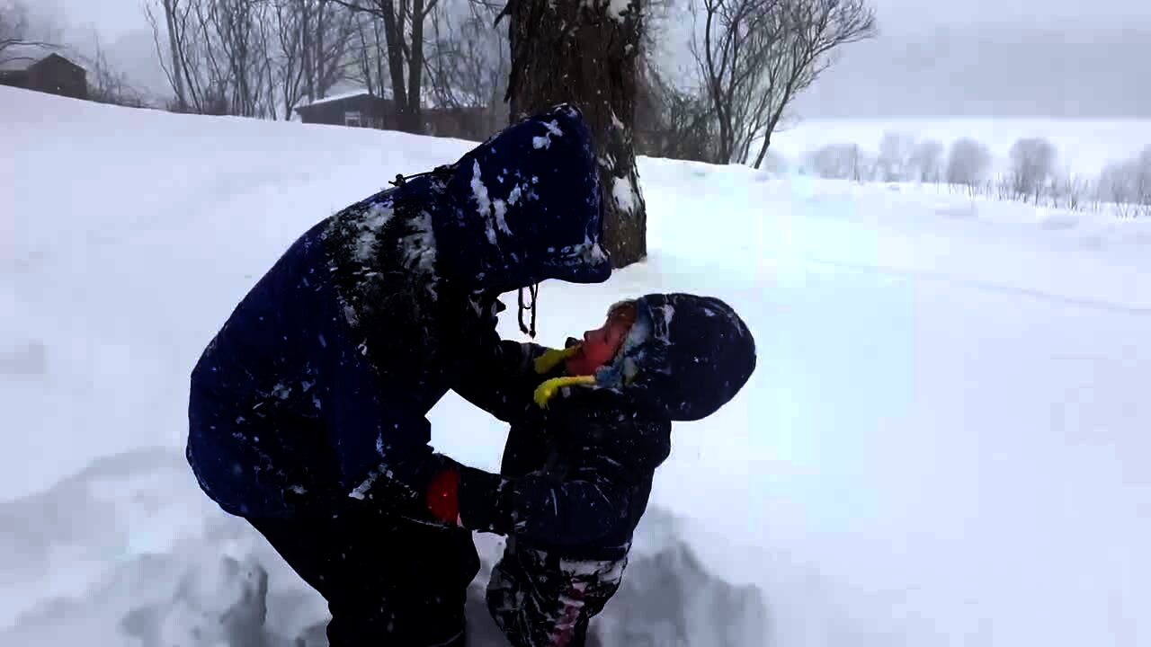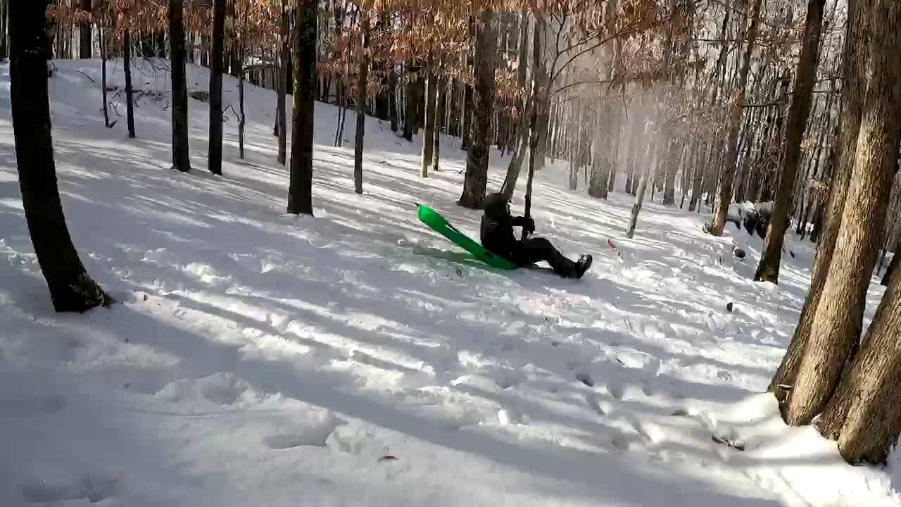 Action at the end, A woman struggles to sit on a tube in the snow as the wind blows and she talks then falls outdoors.