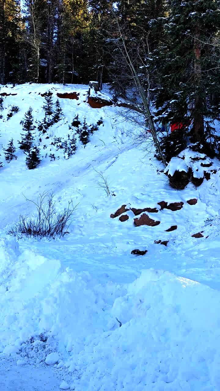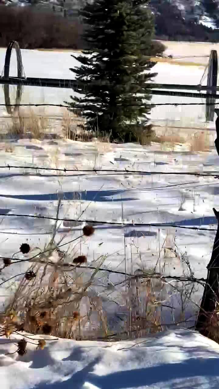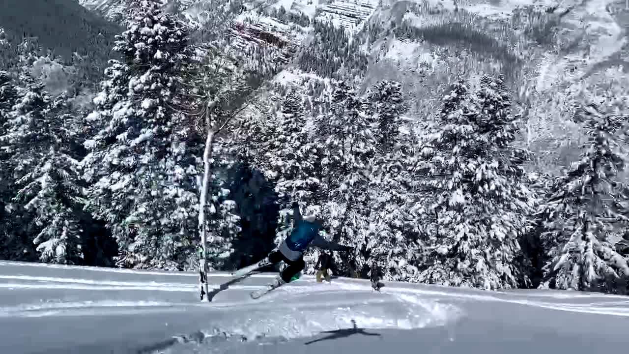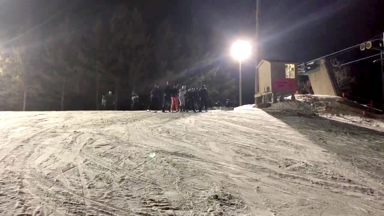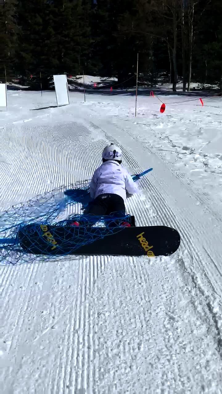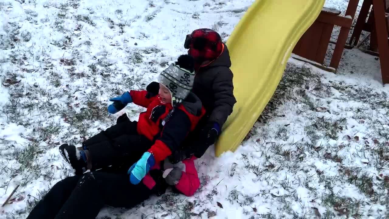 Action at the end, A woman struggles to sit on a tube in the snow as the wind blows and she talks then falls outdoors.