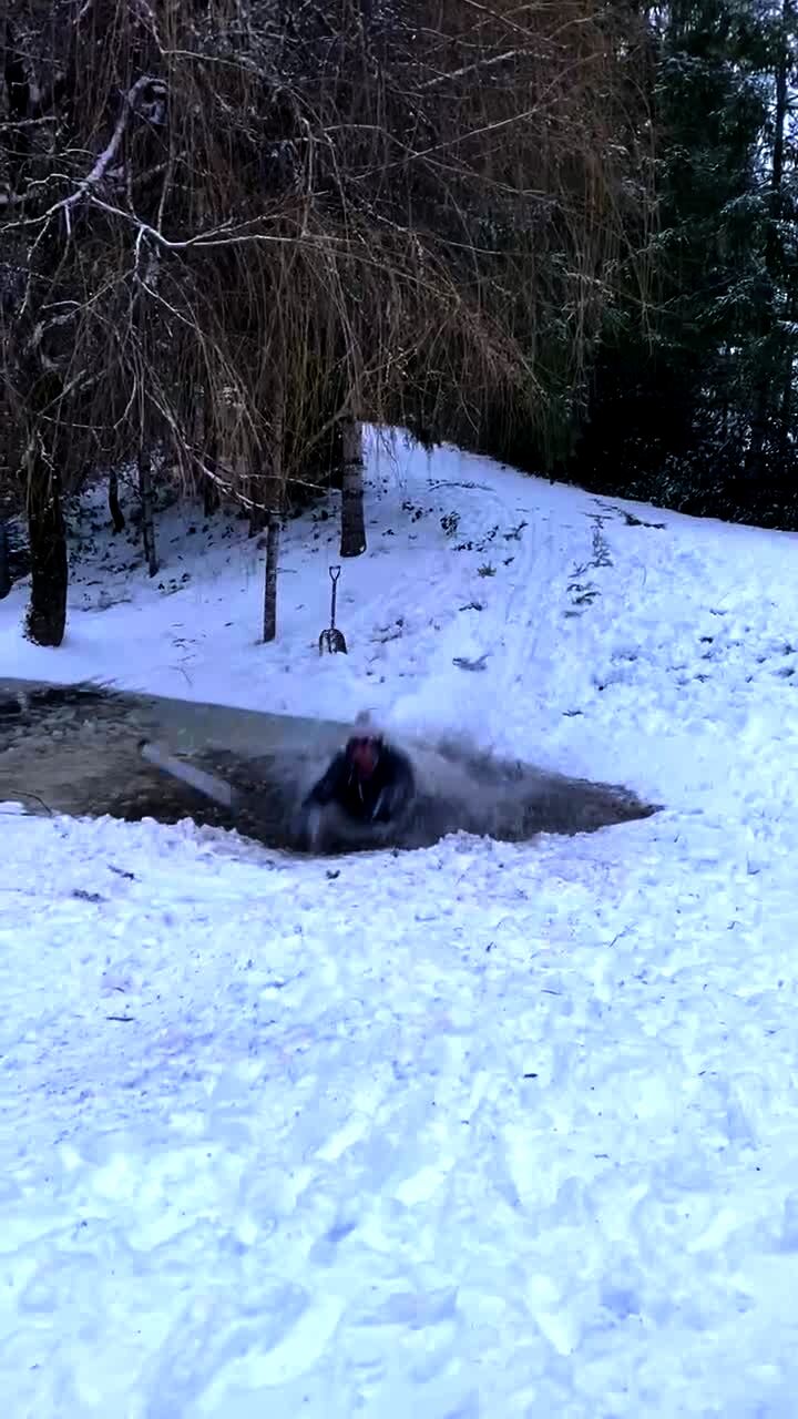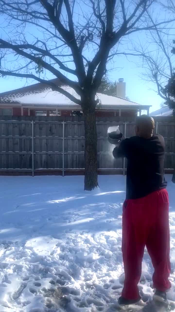 A man throws boiling water into the cold air, then the water falls on him and he screams.