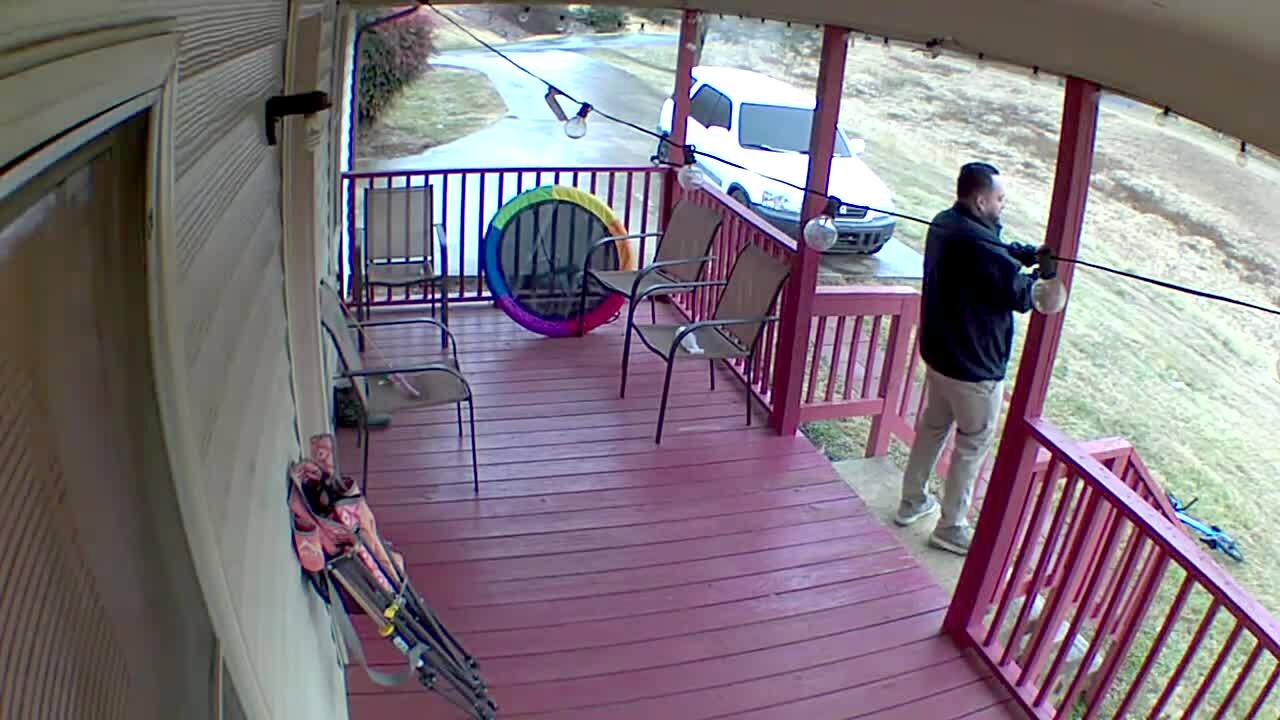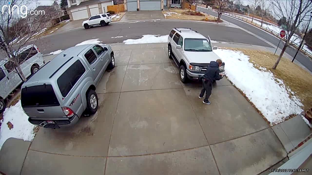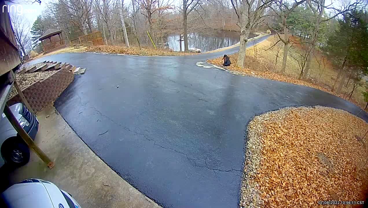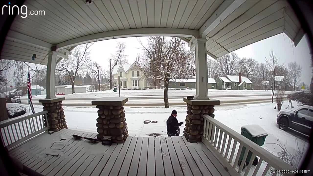 A man slips on some icy camper stairs and falls in a driveway. Security footage.