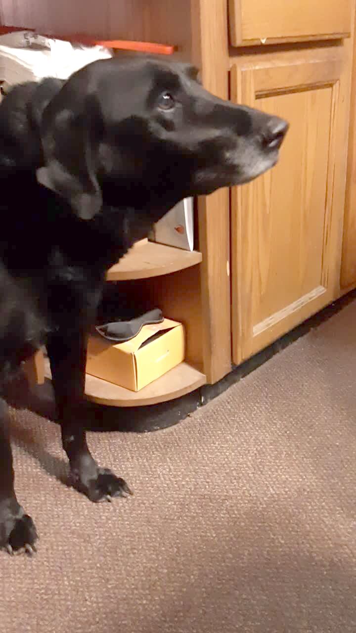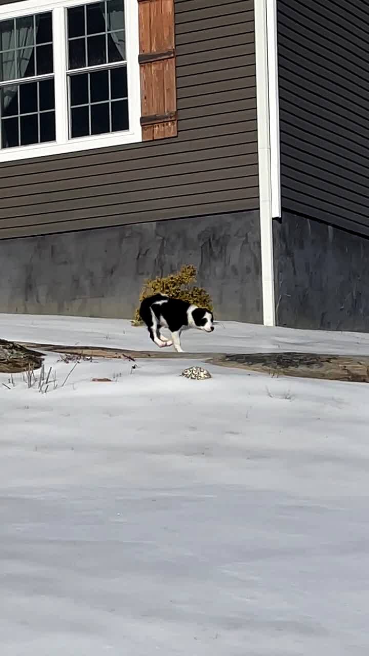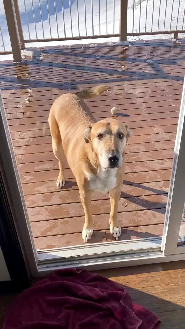 A woman tells a Labrador retriever dog at home not to be nervous about deep snow in a yard, but he jumps up and shuts the door twice.