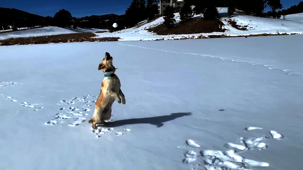 A young girl throws a balloon in the air in a snowy yard and a dog jumps and tackles her, knocking her down.
