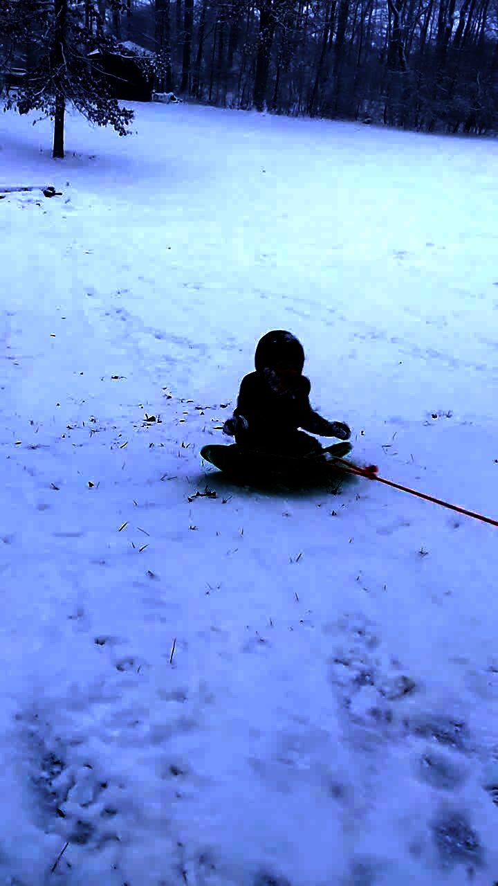 A tot boy sits on a sled and is pulled up a hill in the yard. The boy falls backwards off the sled and slides on him back on the winter snow down the hill.