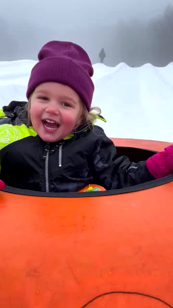 A young girl rides down a mountain on a tube and smiles, then she suddenly frowns as it speeds up.