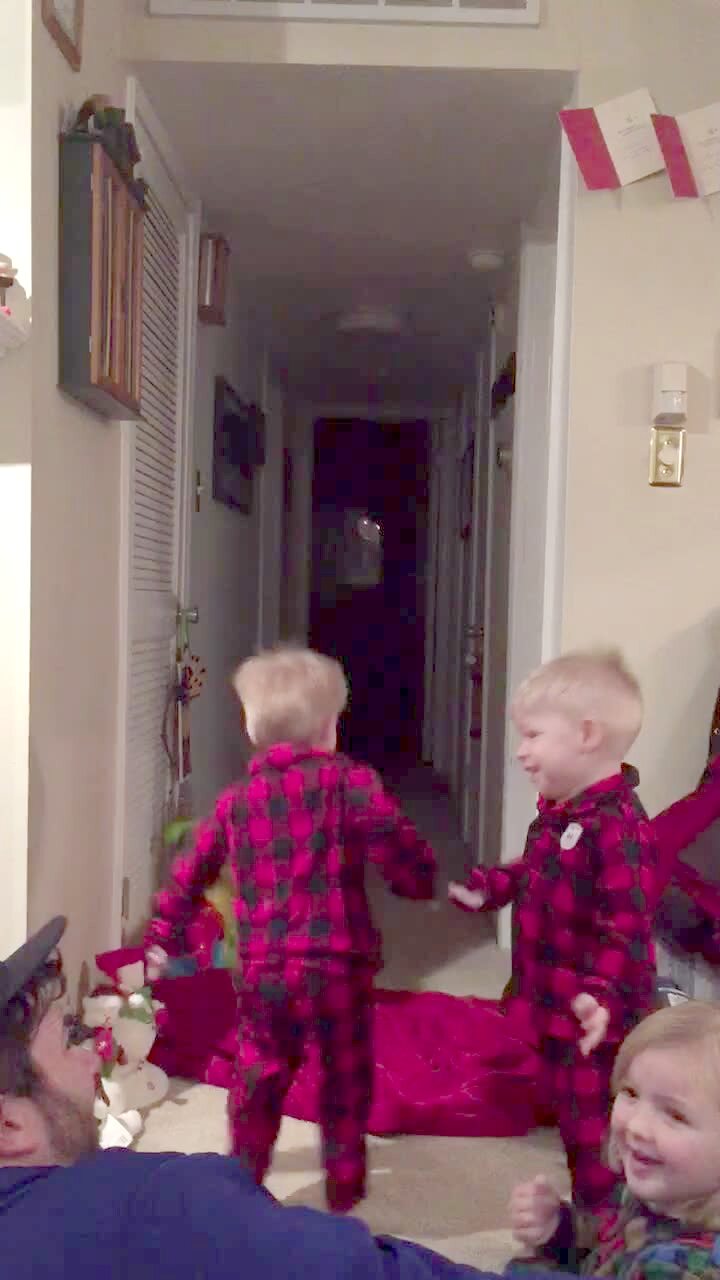 A tot boy drags his baby brother along the floor by the leg of his pajamas indoors.