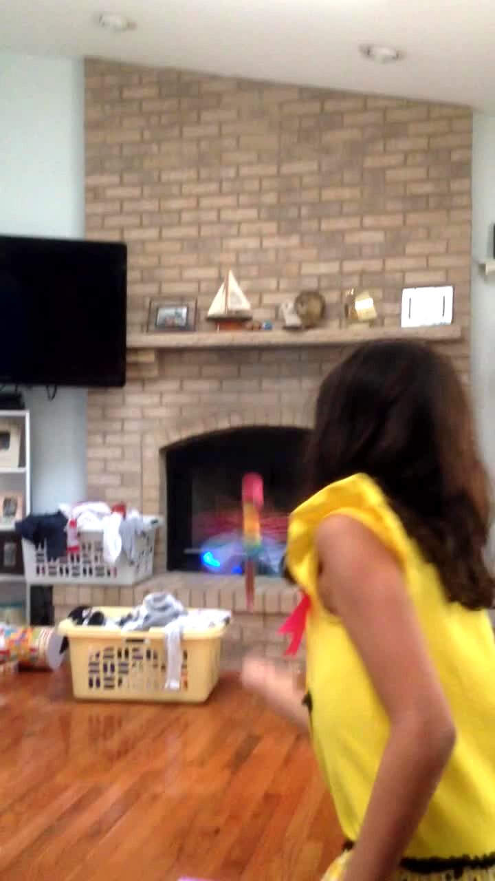 A tot girl throws her tot brother into a postcard stand for blocking her dancing into camera indoors.