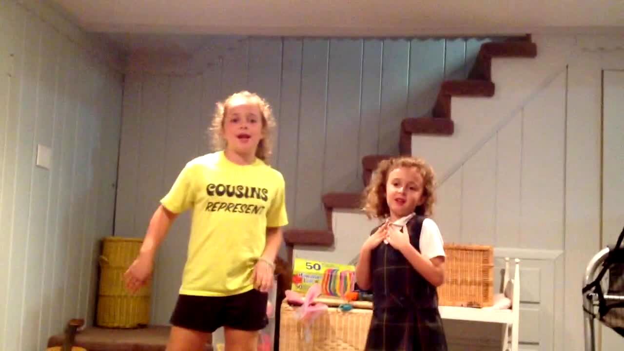 A little girl plays and reads with a girl tot indoors as a man sleeps in a chair and the woman behind camera says he was supposed to put them to bed.