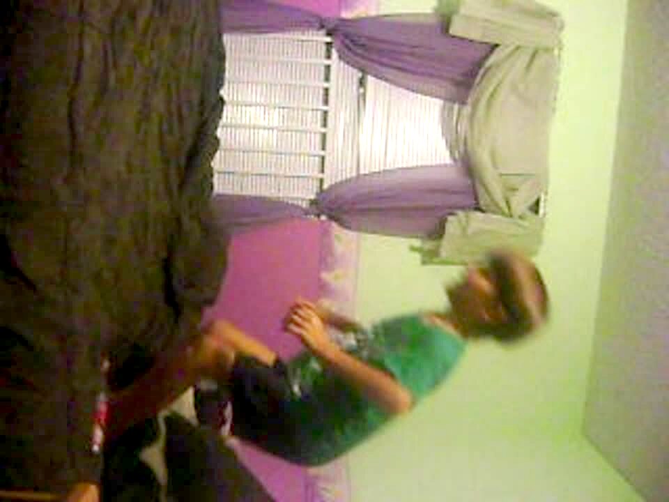 Kids jump flip on mattress, teen boy hits his head hard on a rocking chair when he flips in front of the camera. The camera shakes.