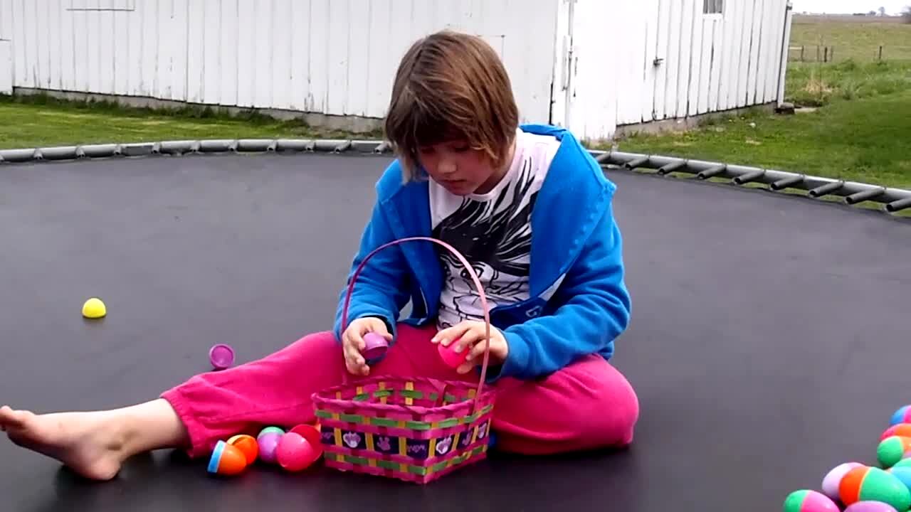 Boy punches punching bag on back porch, bag bounces back and hits tot girl in face, knocks her off stool.