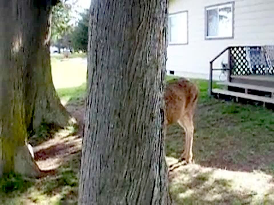 Black dog jumps up and down outside. Dog's head pops in and out of frame. Kid laughs.
