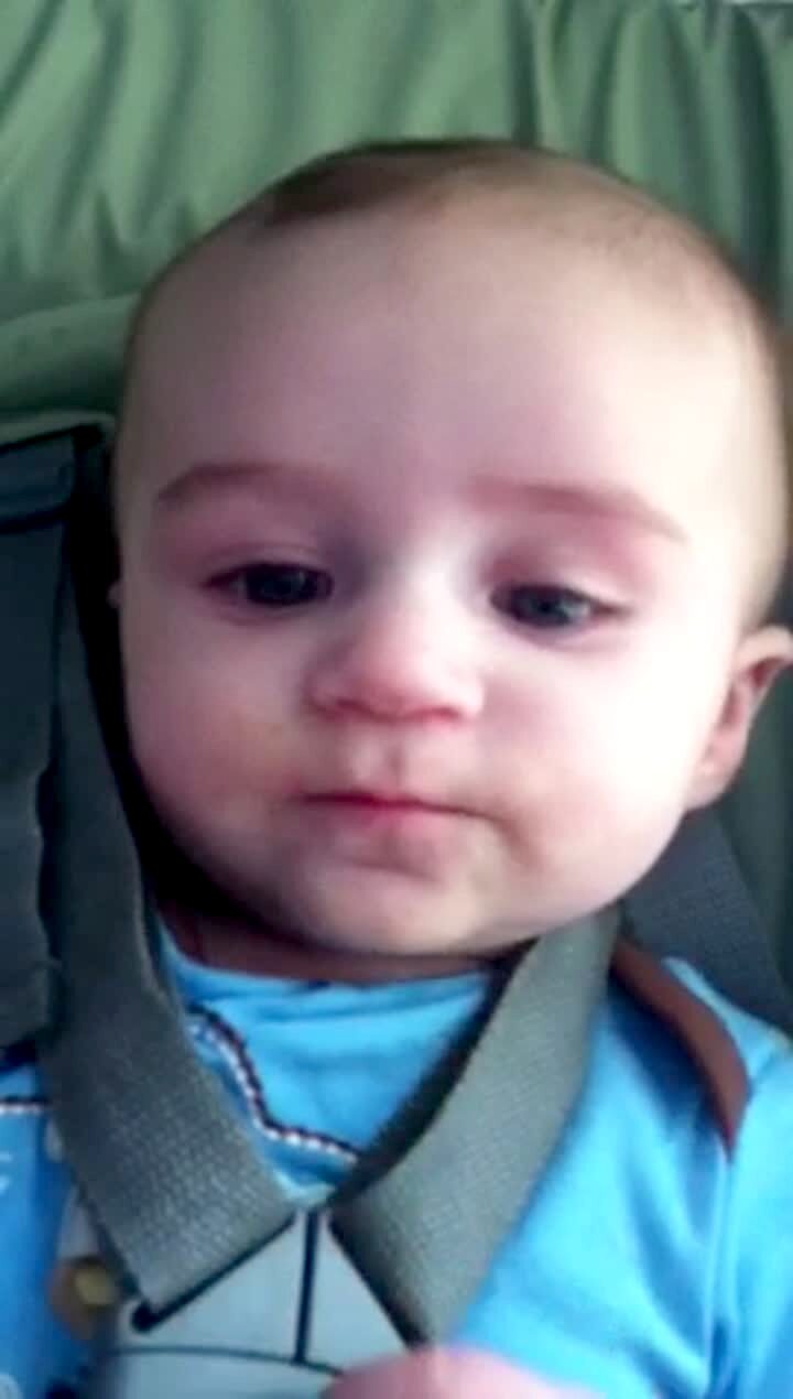 A man asks his baby boy to say "Daddy" and the boy burps loudly indoors.