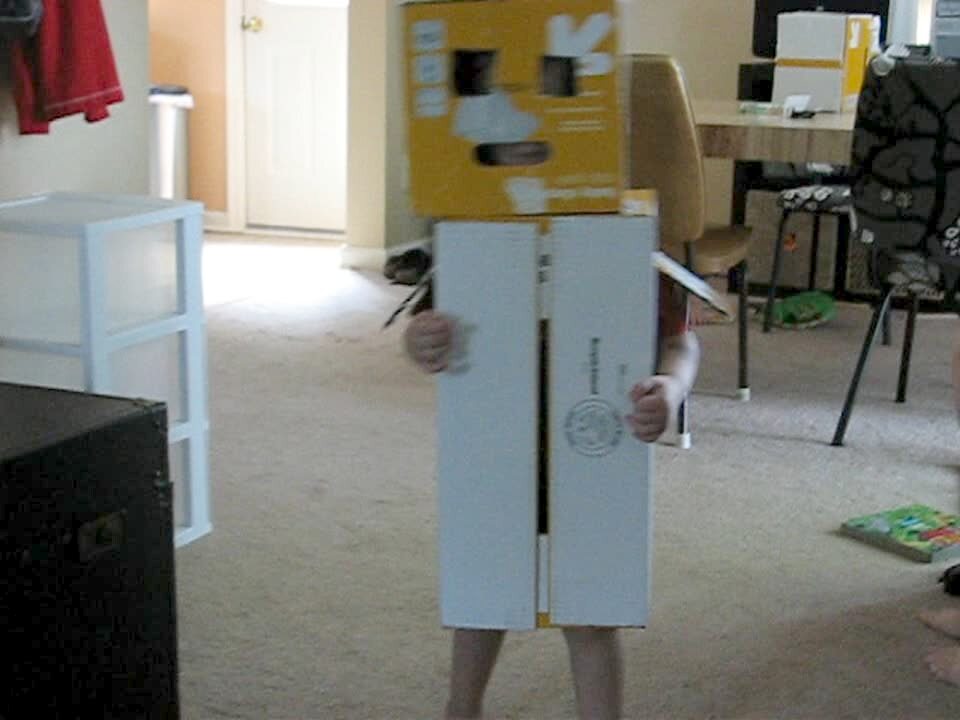 A tot boy walks around a living room dressed in a robot costume made of cardboard boxes. He says 'Bee bop" over and over. He gently walks into his tot brother. Then he falls over on the ground.