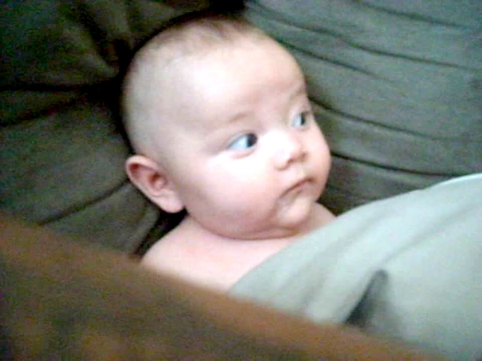 Baby girl on couch smiles big when mom says "hi, baby." Cute.