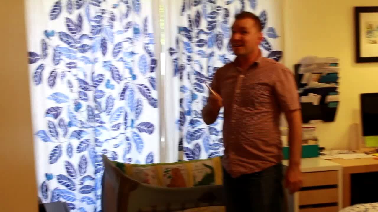 A man walks into a room and finds a baby play pen with a positive pregnancy test. His wife reveals they're having their third baby and he is shocked and surprised and suggests they'll have to get a new house and car.
