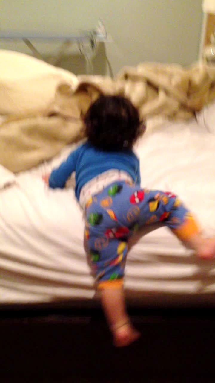Little boy tot runs away from his mom in an attempt to avoid bed time and slides effortlessly down the carpeted stairs indoors.