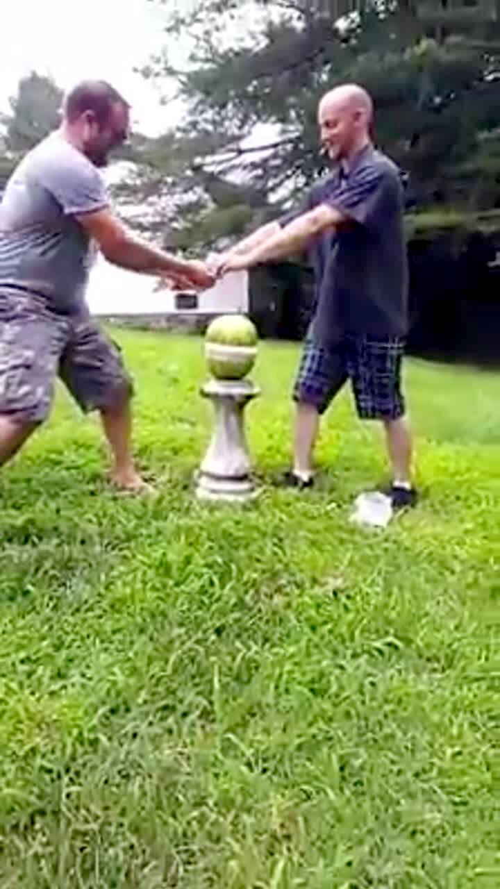 Two men participate in the watermelon rubber band challenge and the watermelon explodes in slow motion outdoors.