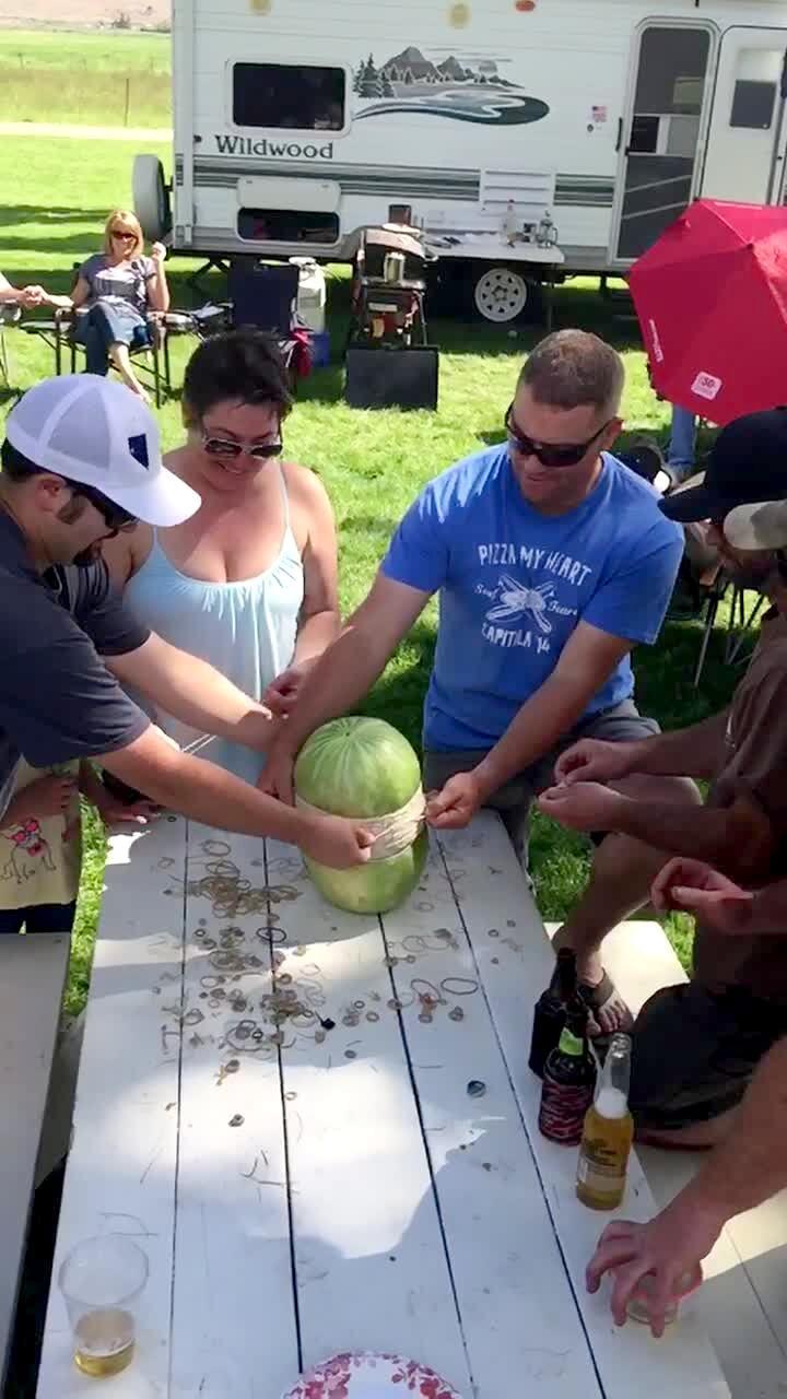 Three men and a woman put rubber bands on a watermelon until it explodes and hits the woman in the face. AA: Rubber Band Watermelon Challenge.