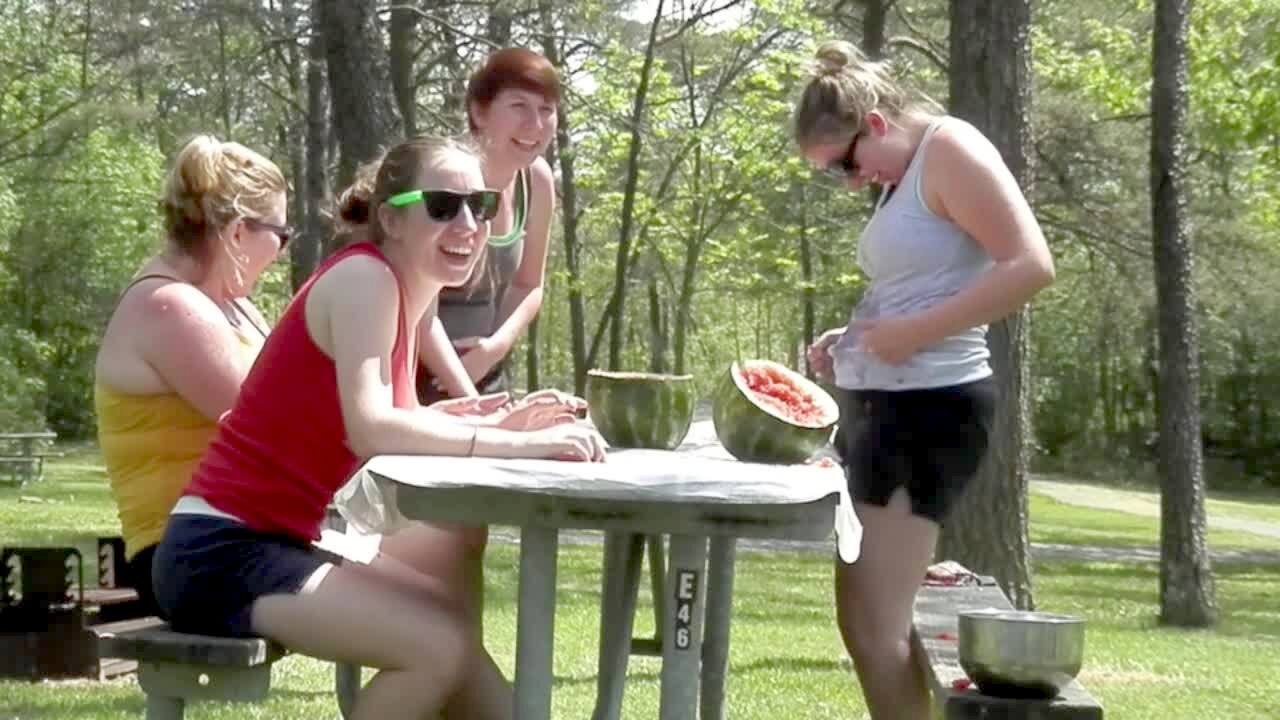 Several women put rubber bands around a watermelon on a bench until it explodes until :13.