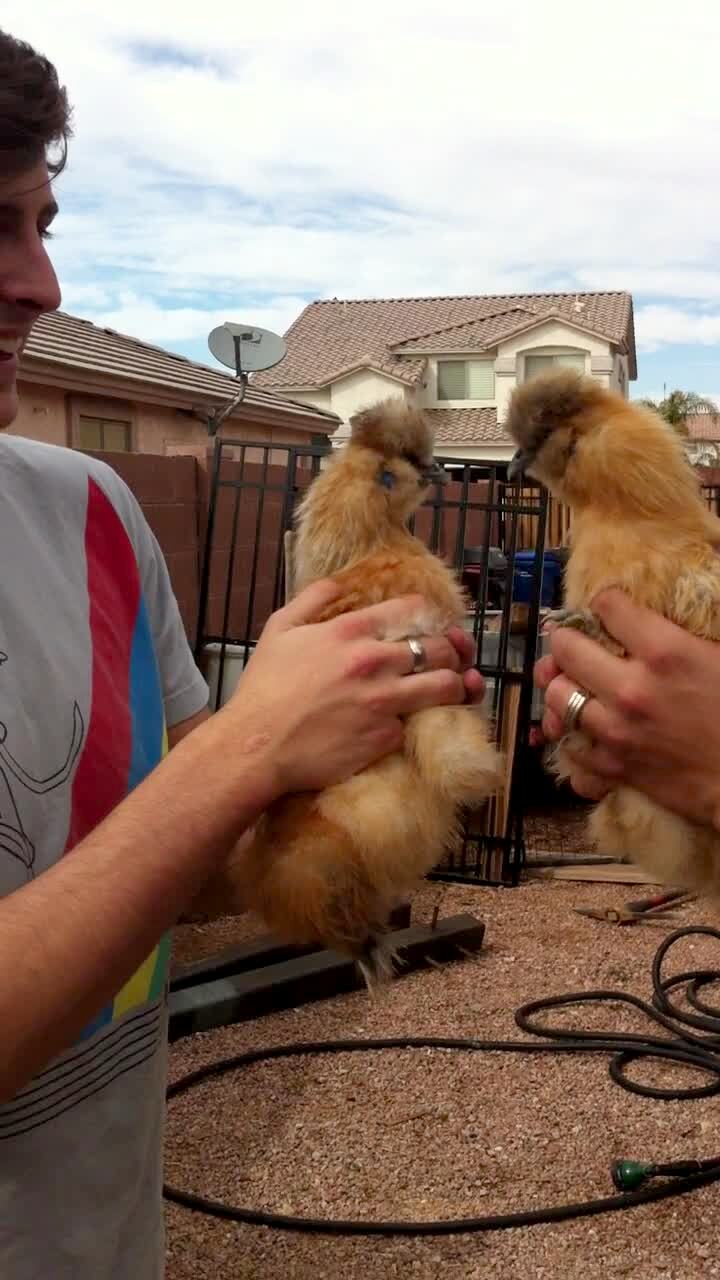 Two men hold two chickens and wiggle them around while their heads stay stationary.